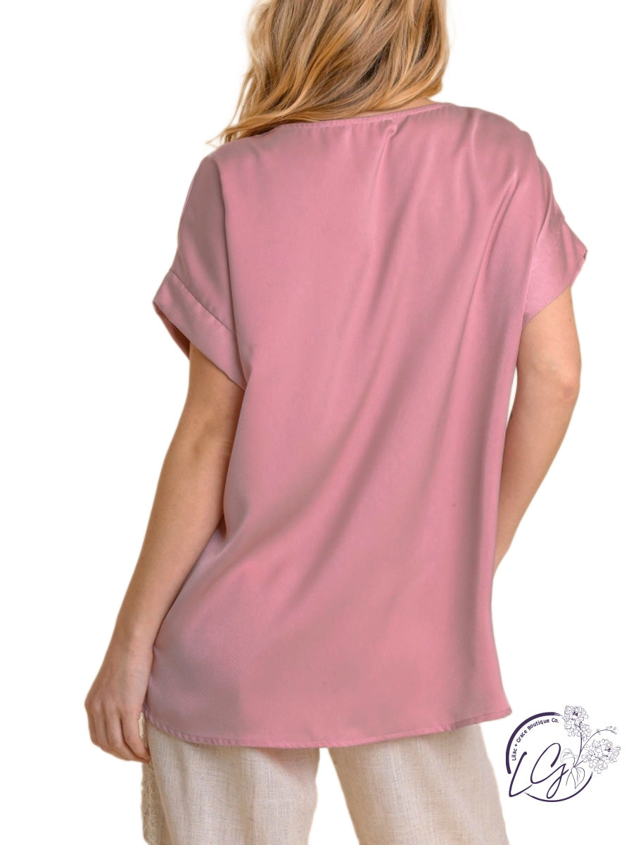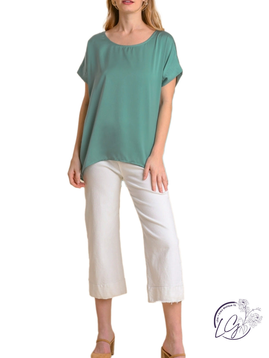 Short Sleeve Round Neck Satin Top with High Low Frayed Scoop Hem.