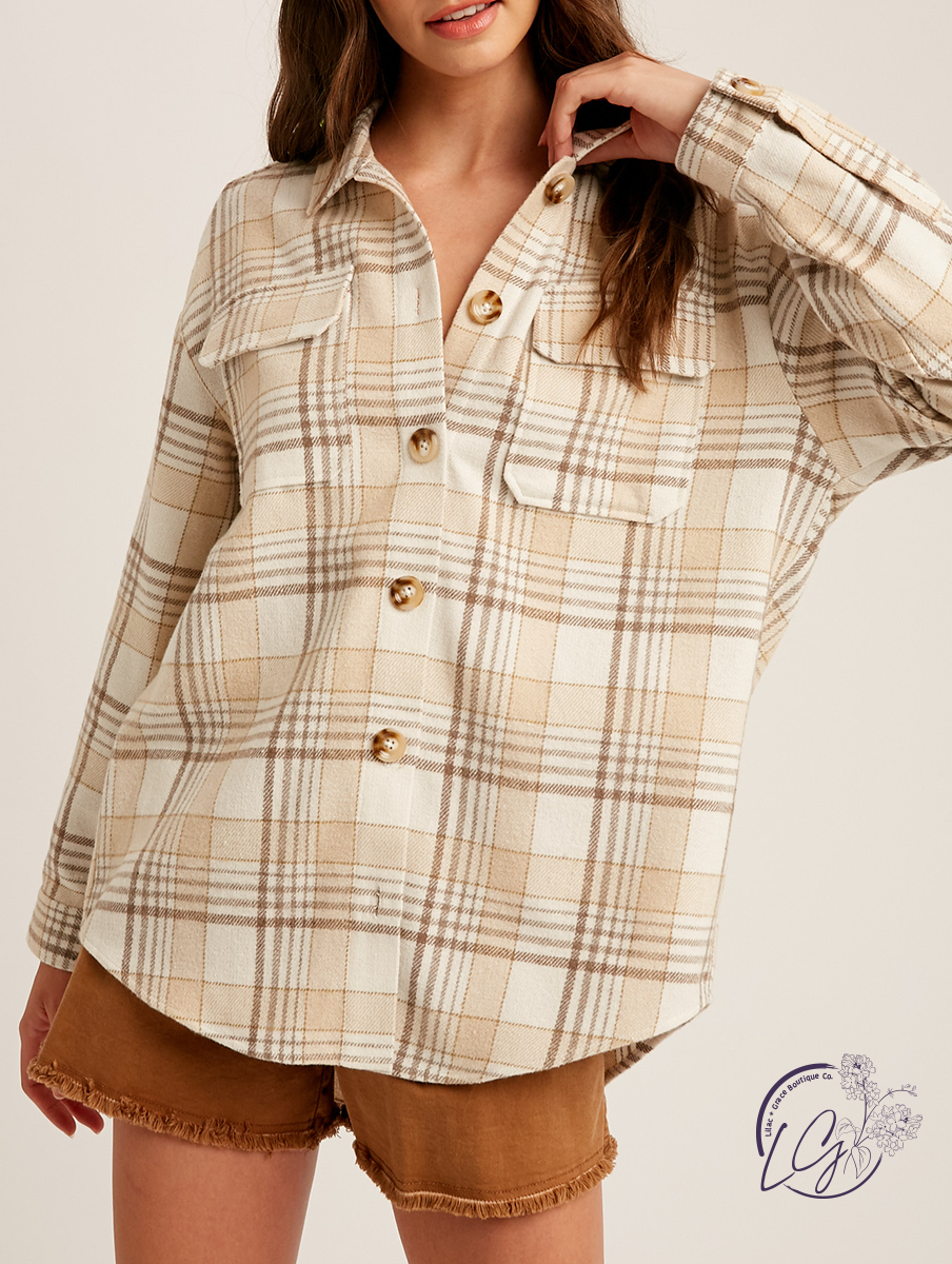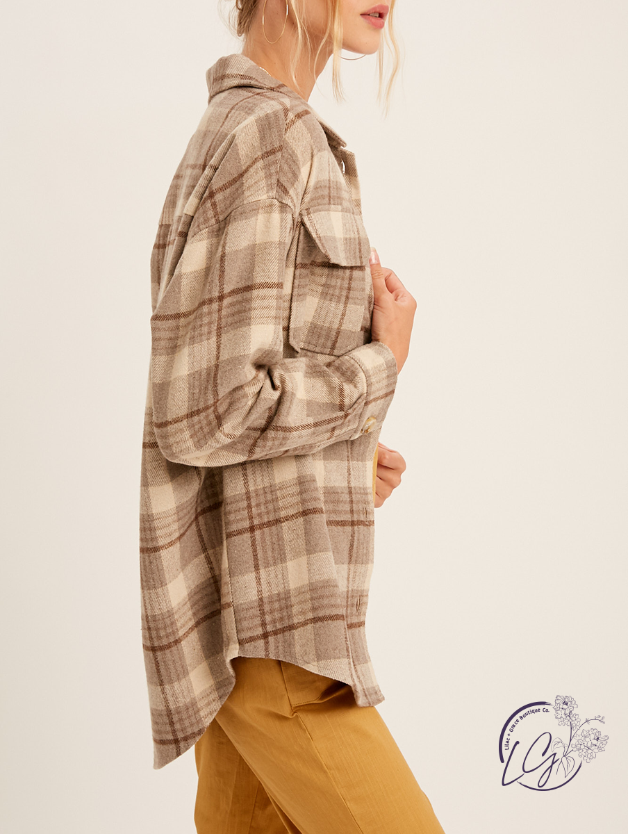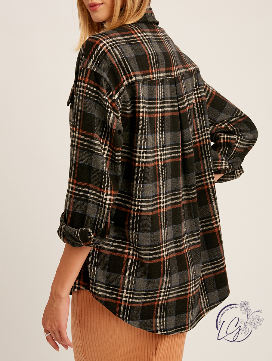 This plaid flannel shacket features a button-front, collar, and two chest pockets. With long sleeves and buttoned cuffs, it offers a relaxed fit perfect for bold, effortless style.