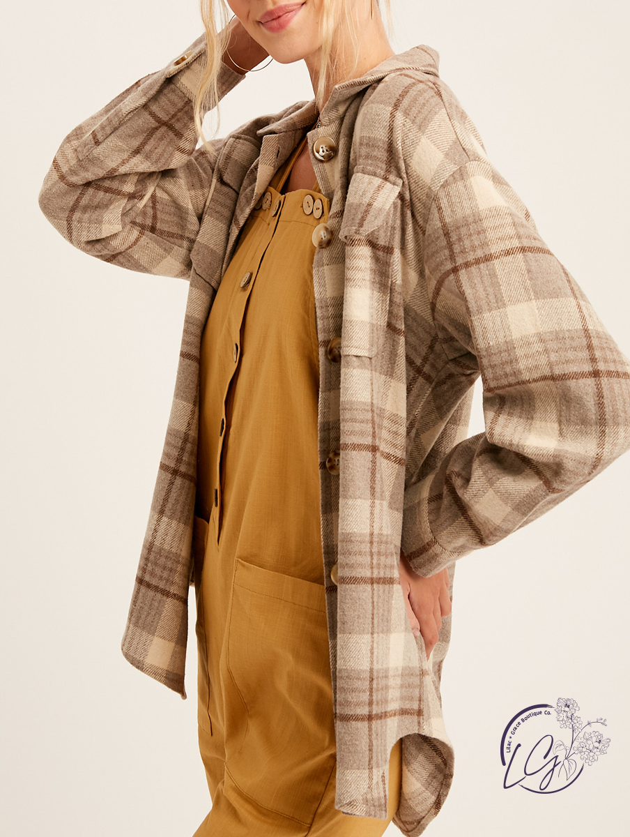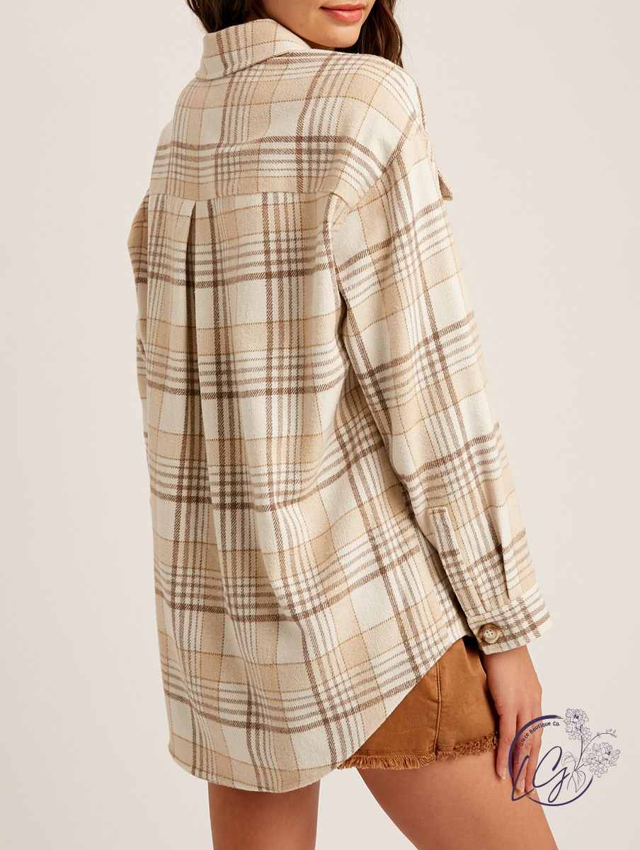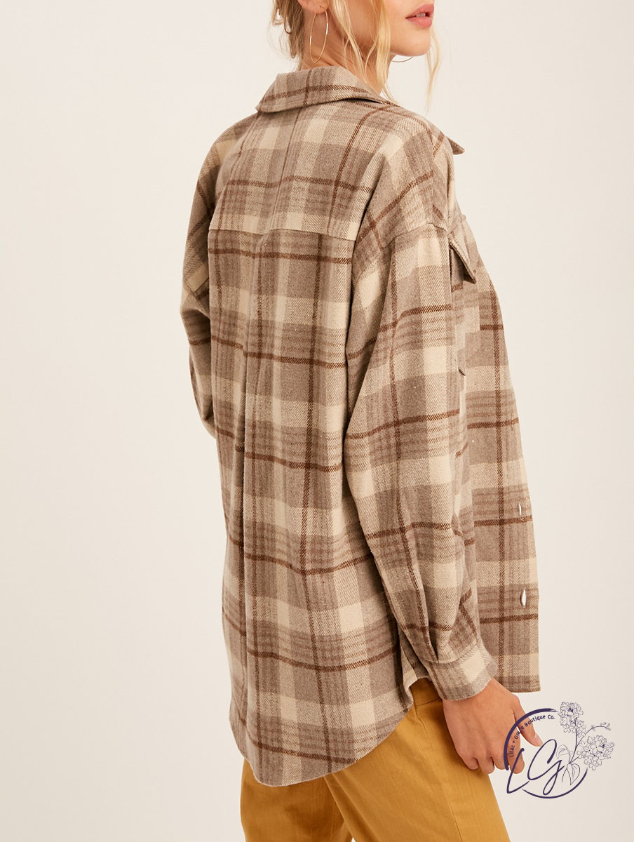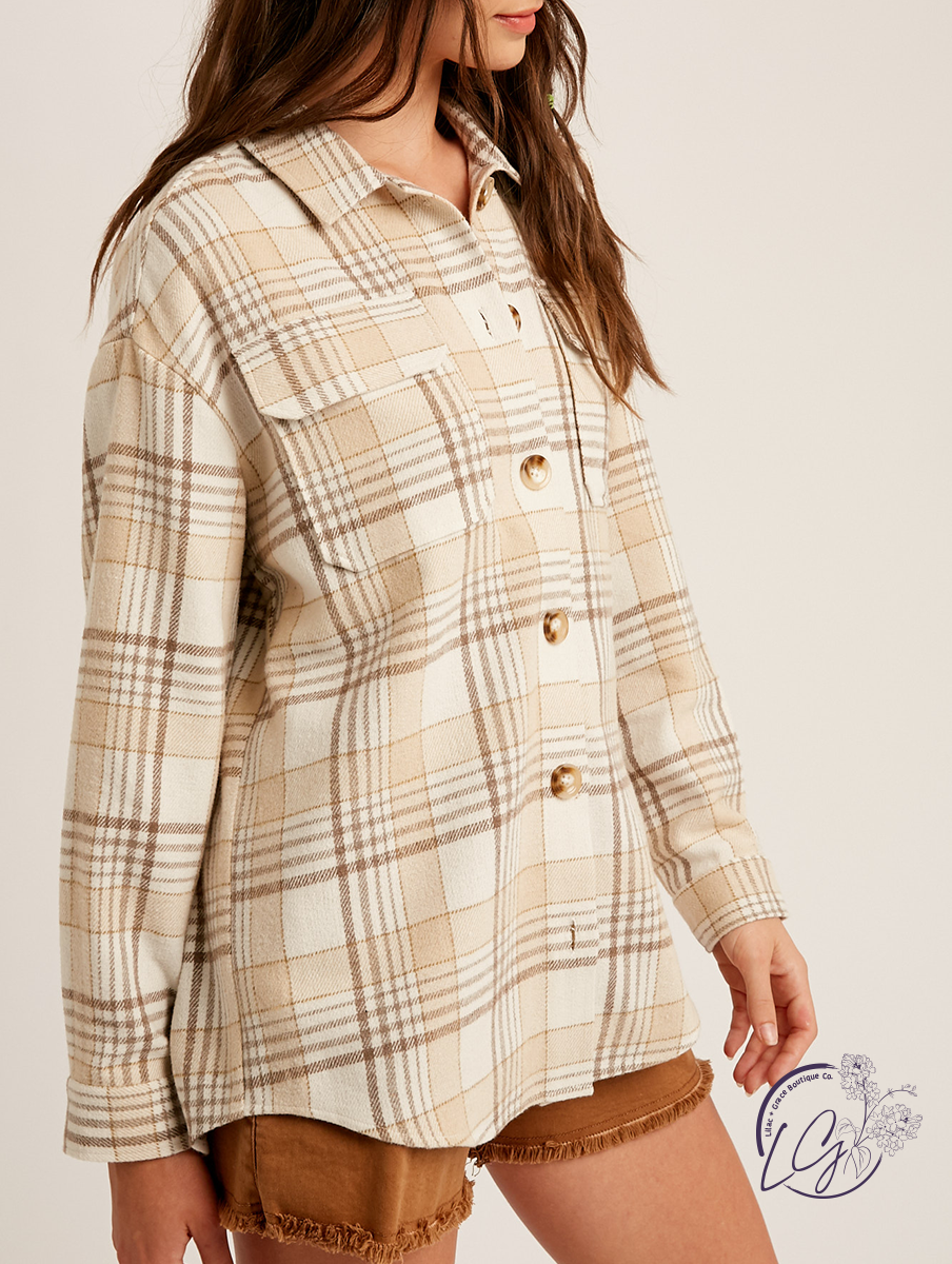 This plaid flannel shacket features a button-front, collar, and two chest pockets. With long sleeves and buttoned cuffs, it offers a relaxed fit perfect for bold, effortless style.