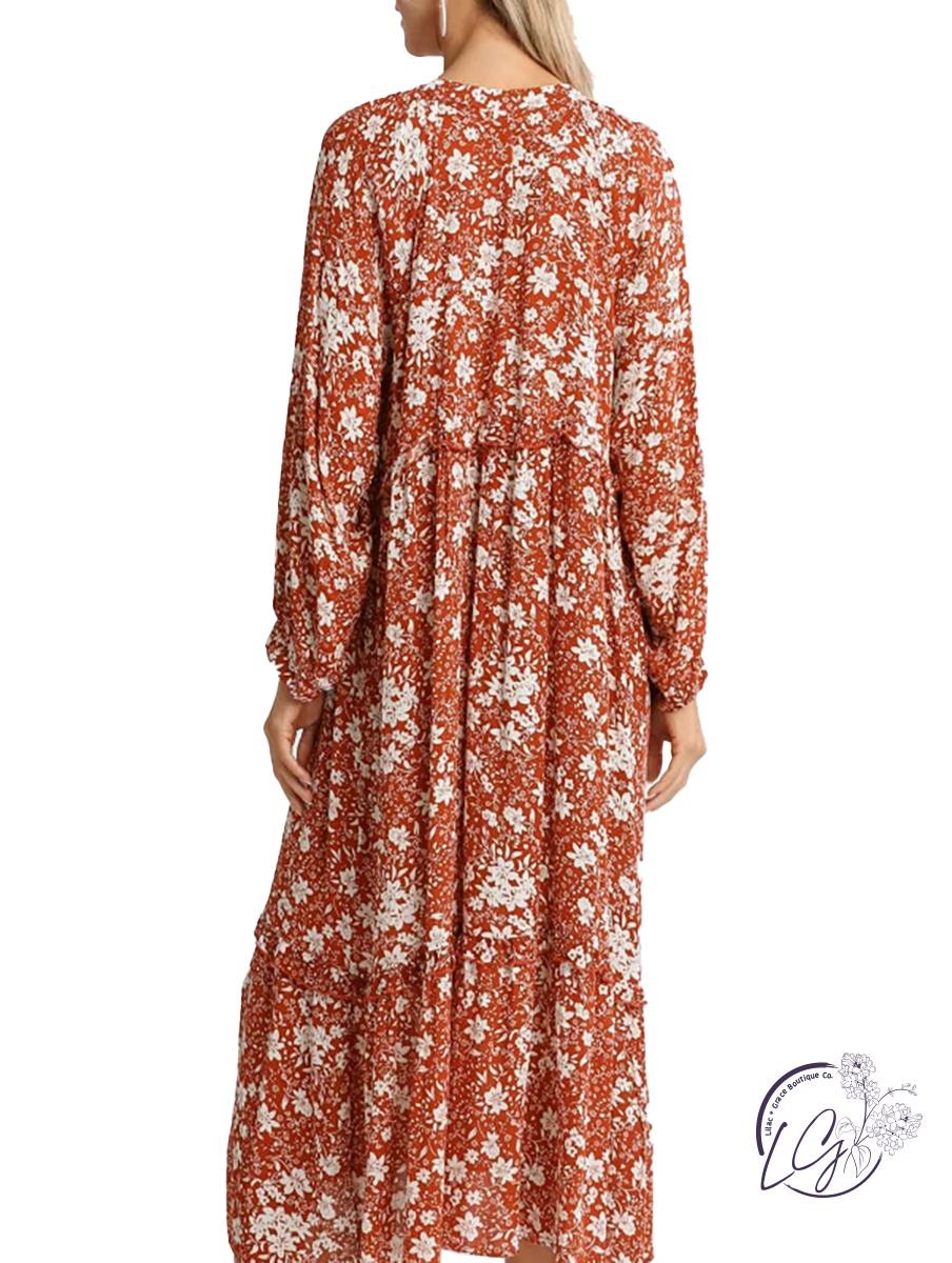 Floral Print Long Sleeve Front Tassel Tie Ruffle Trimmed Details Maxi Dress with No Lining