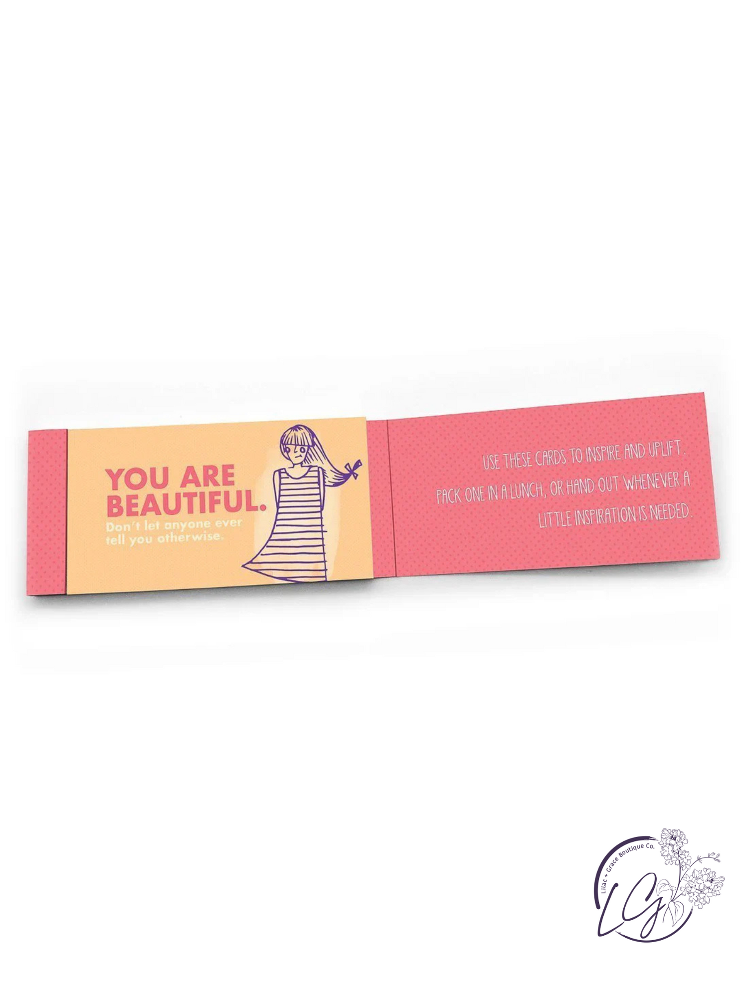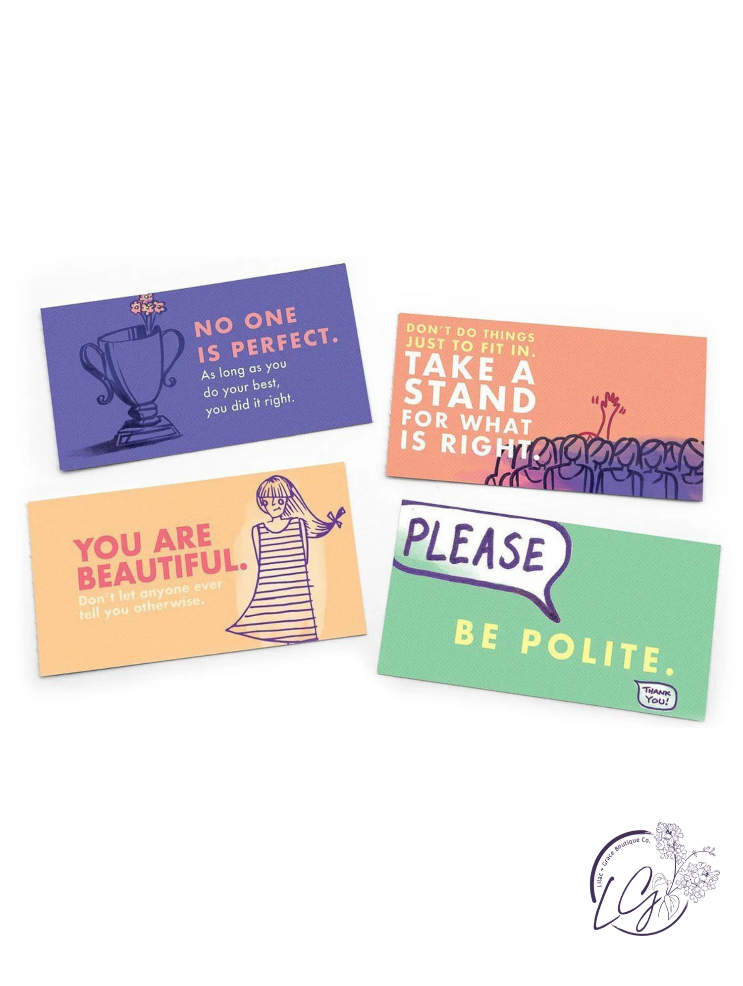 Based on our top-selling book, Being a Girl, these Lunch Notes are filled with inspirational messages and important reminders for young girls. Each card can be torn out of the booklets and are blank on the back, allowing you to add your own notes.