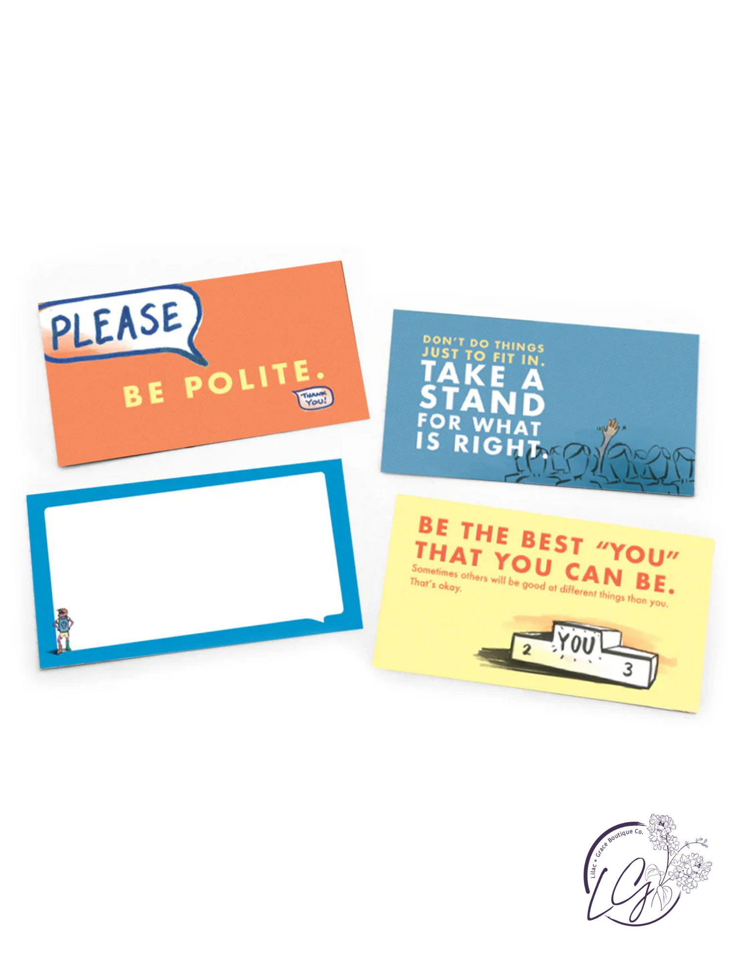 Based on our book for kids, "Being Yourself", these Lunch Notes are filled with inspirational messages and important reminders for young children. Each card can be torn out of the booklets and are blank on the back, allowing you to add your notes.