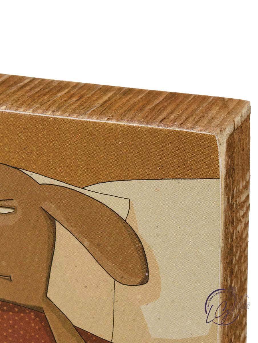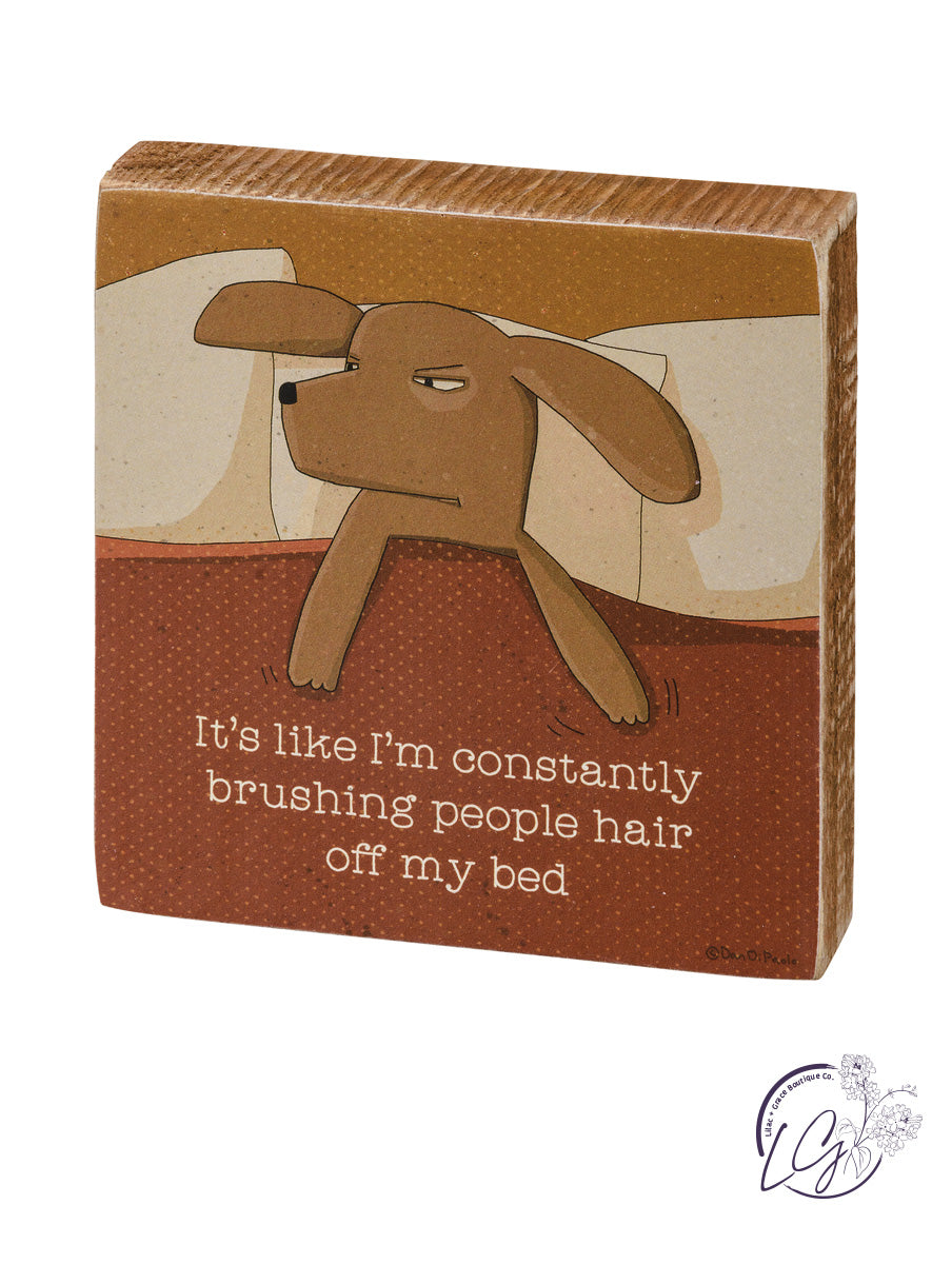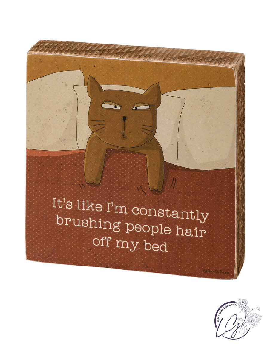 A wooden block sign featuring a rustic-inspired design of a cat in a bed with "It's Like I'm Constantly Brushing People Hair Off My Bed" sentiment. Easy to hang or can free-stand alone.