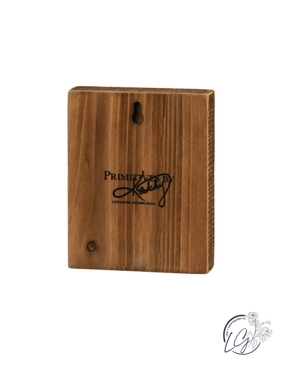 A wooden block sign featuring a block print cat design with "You Lost Me At 'I Don't Like Cats'" sentiment. Features natural stained sides for added interest. Includes predrilled keyhole slot for easy hanging.