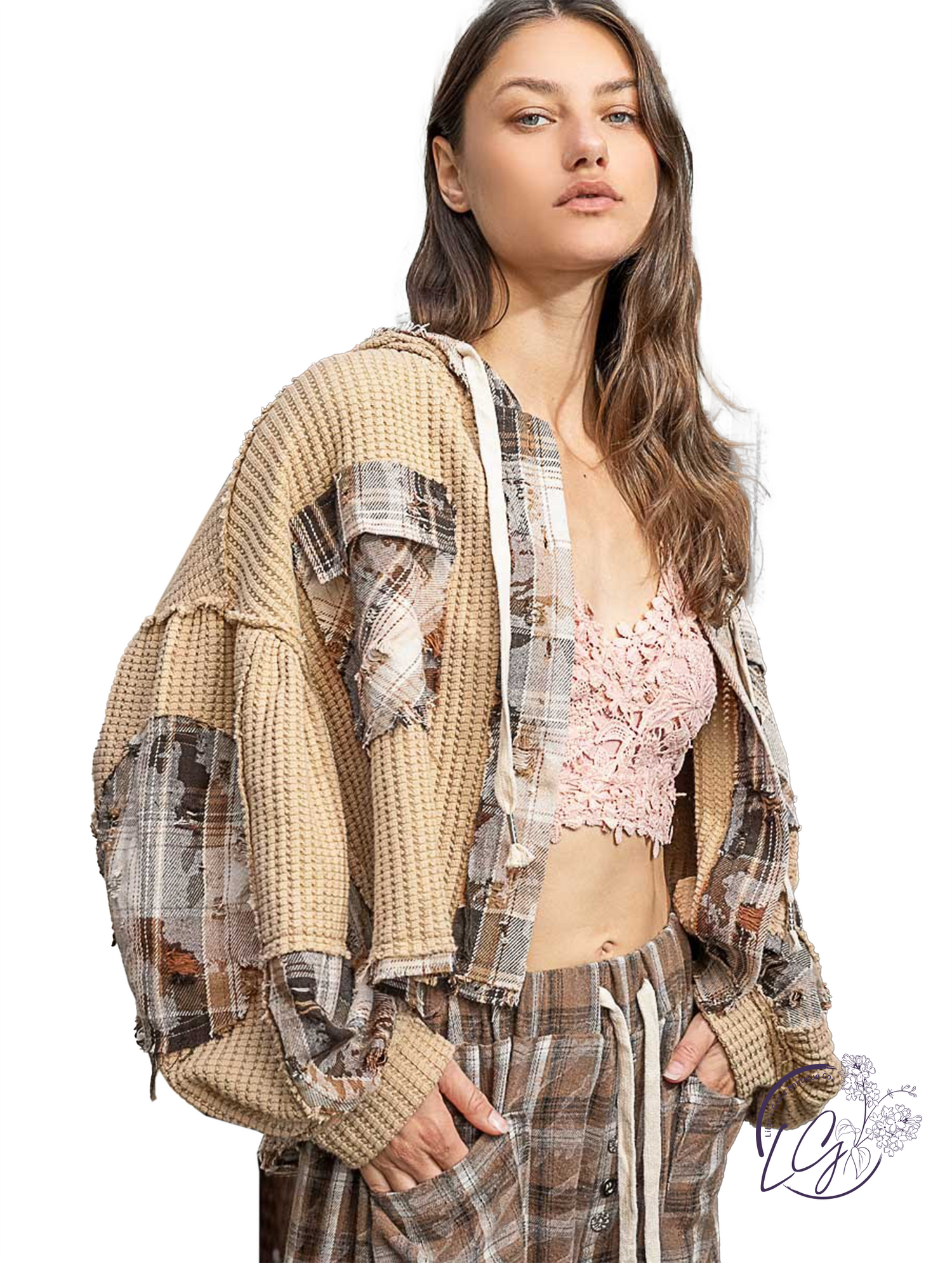 Step out in style with the Blooms At Dusk Knit Jacket. This hooded balloon sleeve top offers a roomy fit and is designed with a cozy thermal fabric, accented with a stylish plaid contrast. Stay warm and fashionable with this must-have piece!