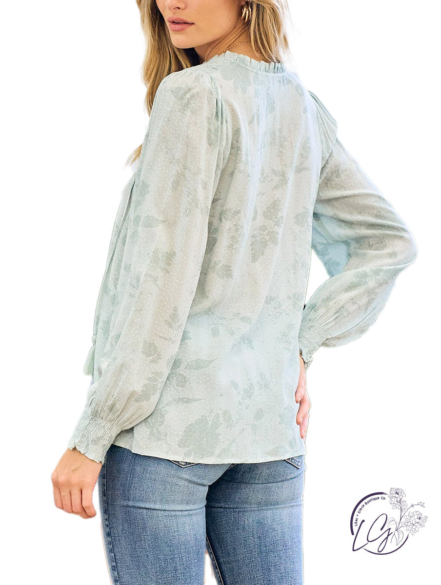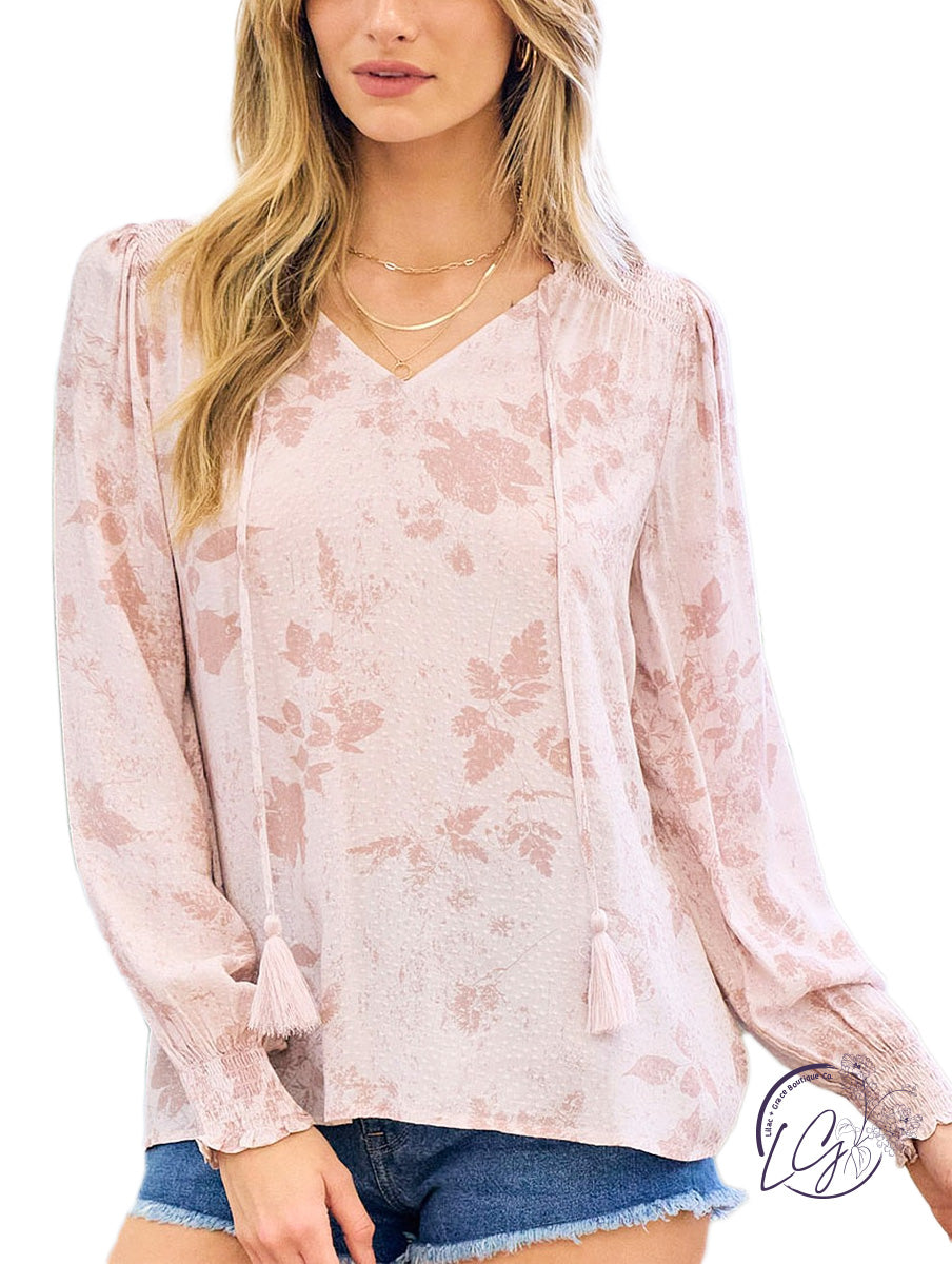 The smocked texture, strategically placed on the blouse, creates a flattering and form-fitting silhouette. This intricate detailing not only adds visual interest but also provides a unique and textured element that sets the blouse apart.