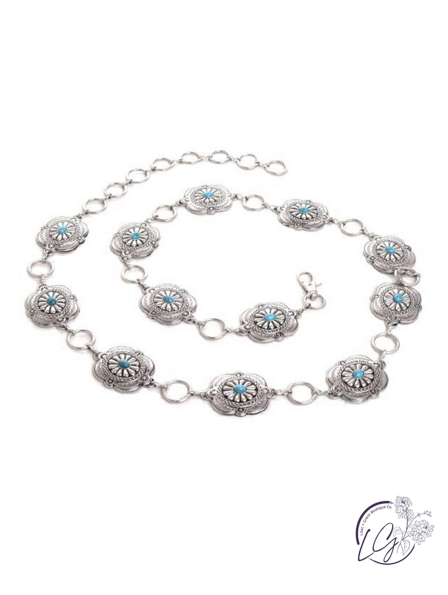 Turquoise stones set in aged metal bring a raw, earthy feel to this chain belt. The linked design adds movement, while the cool blues stand out against denim or soft layers.