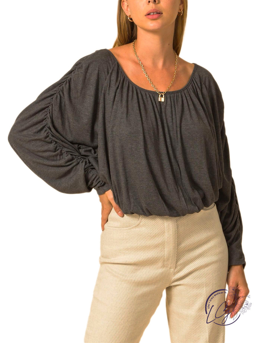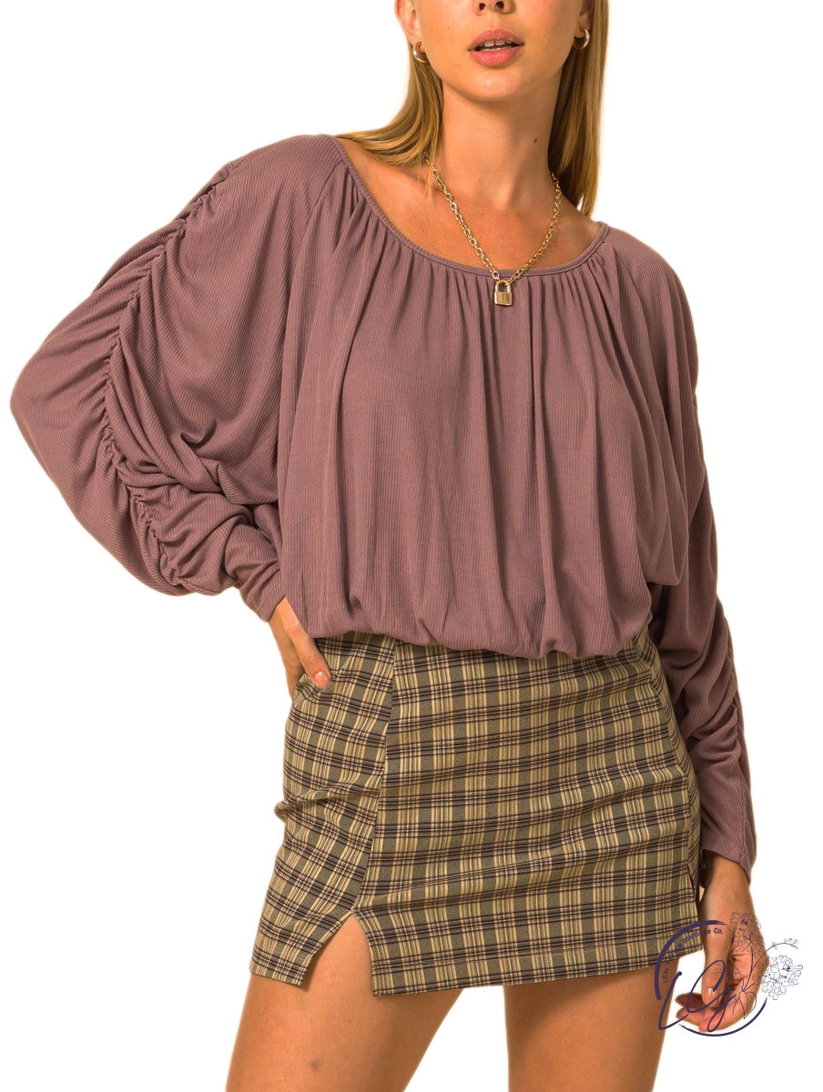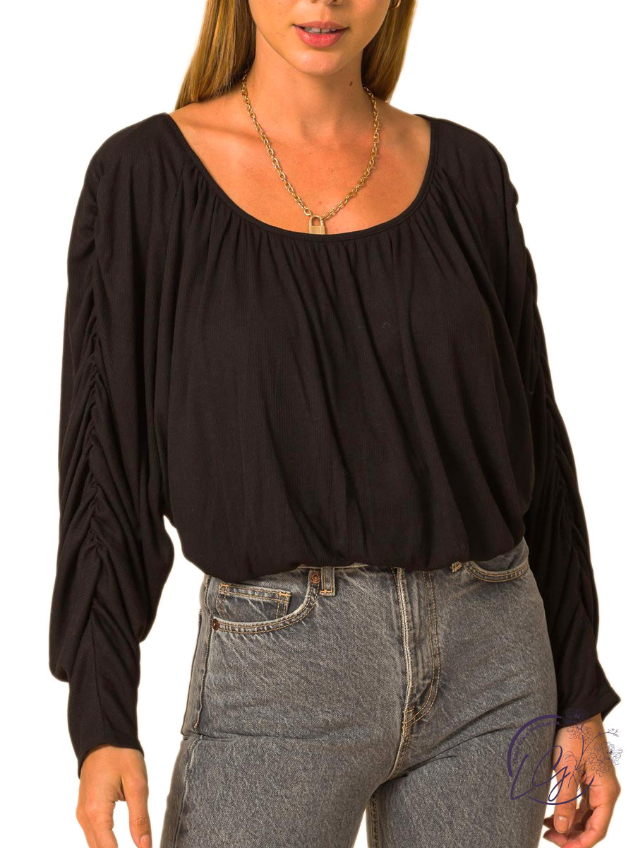 Boat neck shirred dolman sleeve blouse.