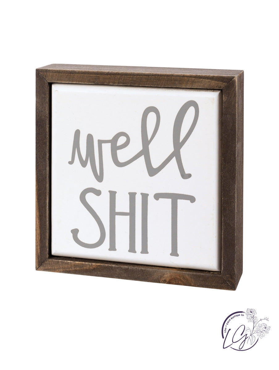 A wooden box sign features a hand lettered "Well Shit" sentiment, enamel-like coating to mimic the appearance of tile, and dark stained sides for added interest. Our Well Shit box sign mini is easy to hang or can free-stand alone.