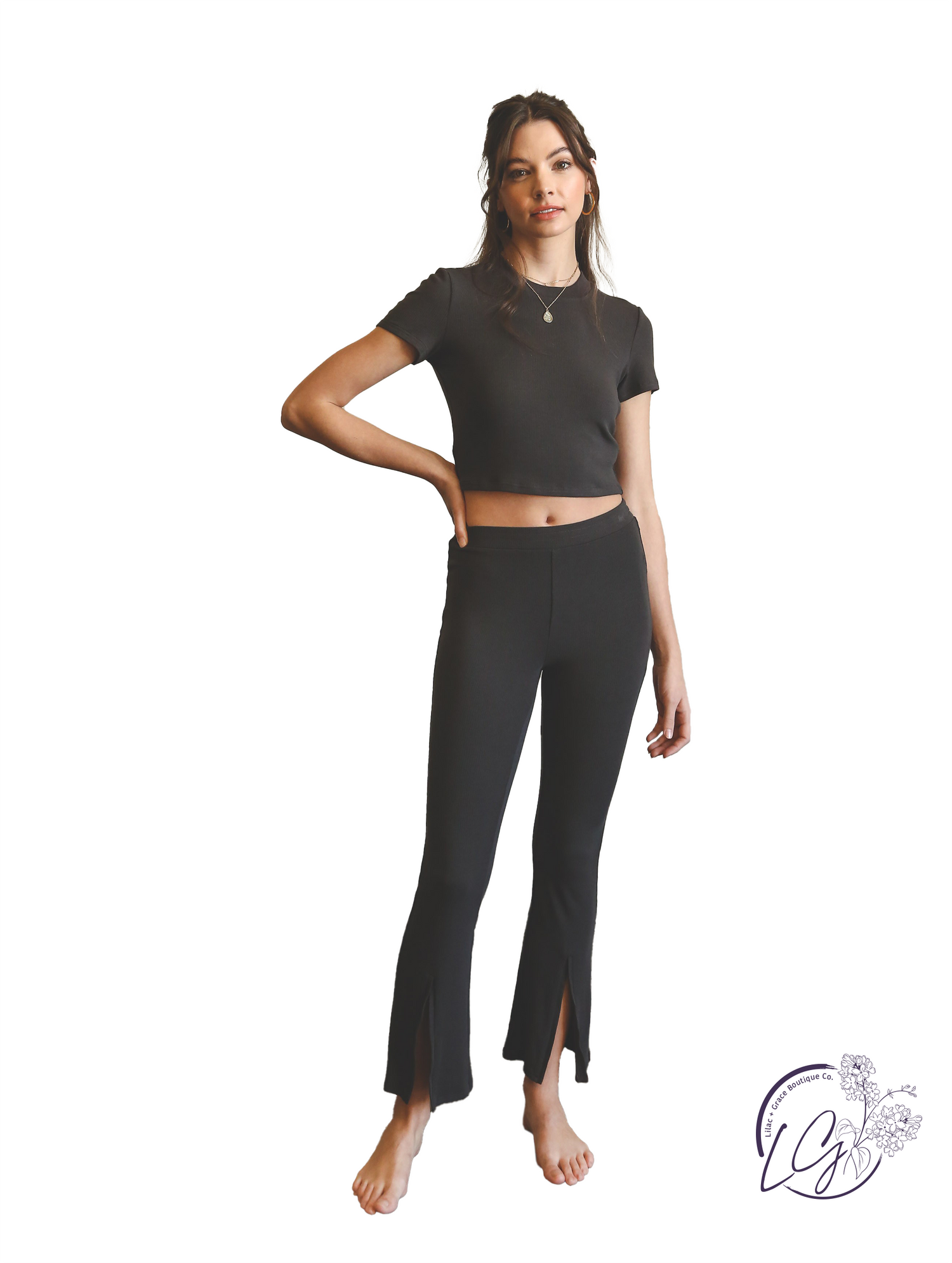 Turn heads and make a statement with these risk-taking, ribbed flared pants! Designed with a sleek, clean hem and a slightly flared, dynamic shape, these pants feature an elastic waistband and a bold slit down the center front. Embrace the adventure and show off your unique style with these Classy & Comfy Ribbed Flared Pants. To achieve the perfect fit, follow the lead of our model who is 5' 10" and wearing a size Small with measurements of 32-26-35.