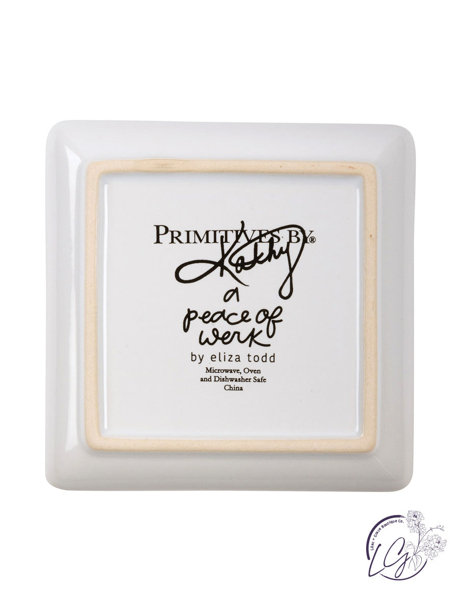 A glossy white stoneware vanity tray featuring whimsical and vibrant designs with sentiment. Our Believe vanity tray is dishwasher safe.