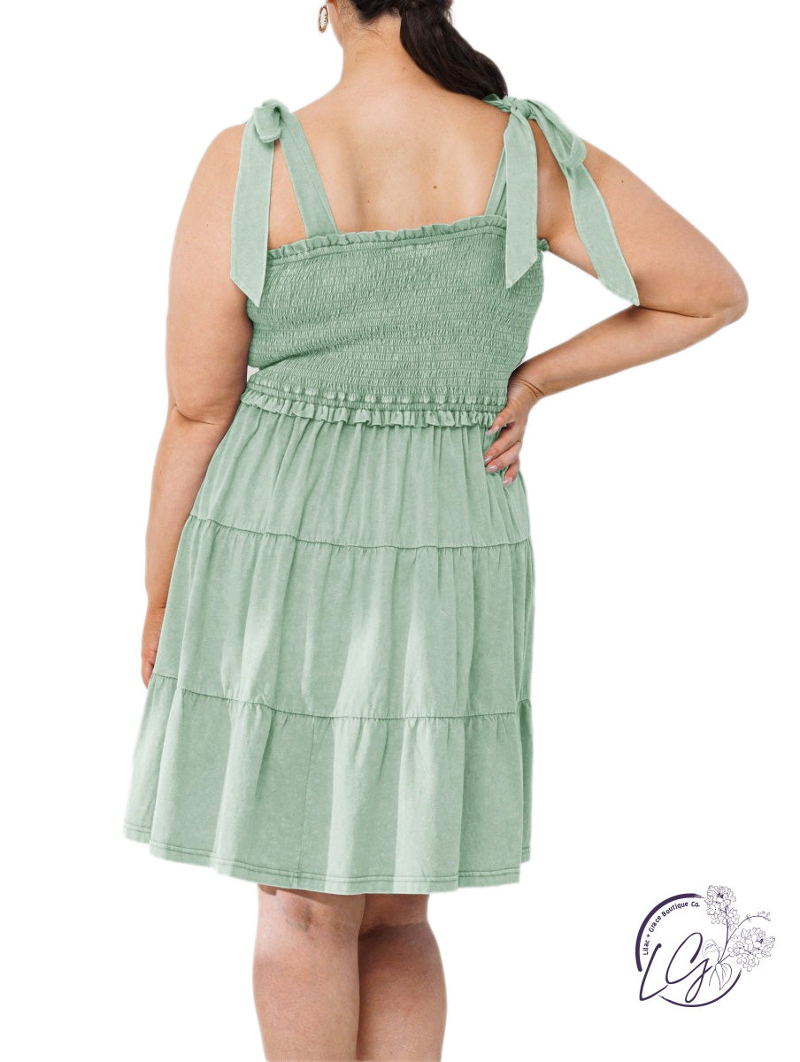 Cotton washed tie-strap smocked mini dress.