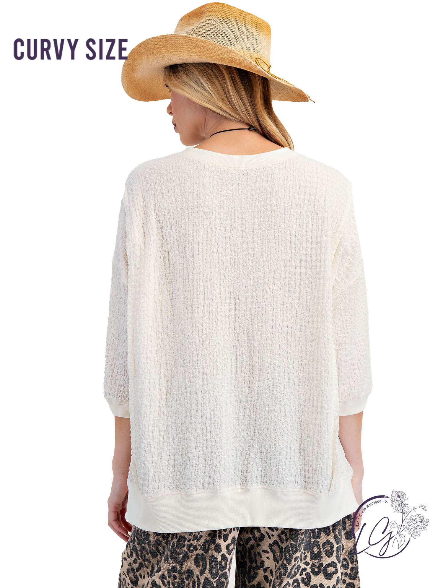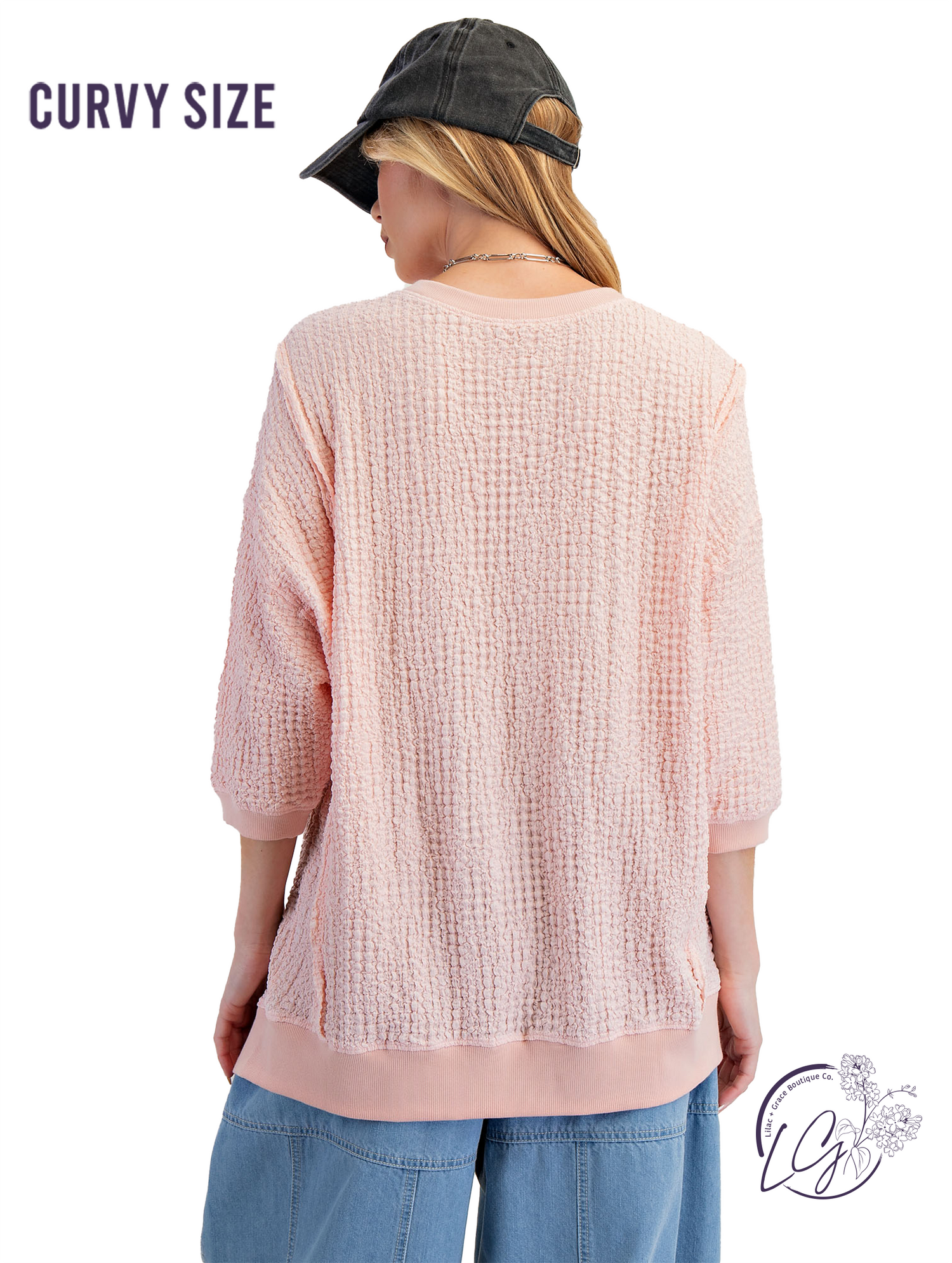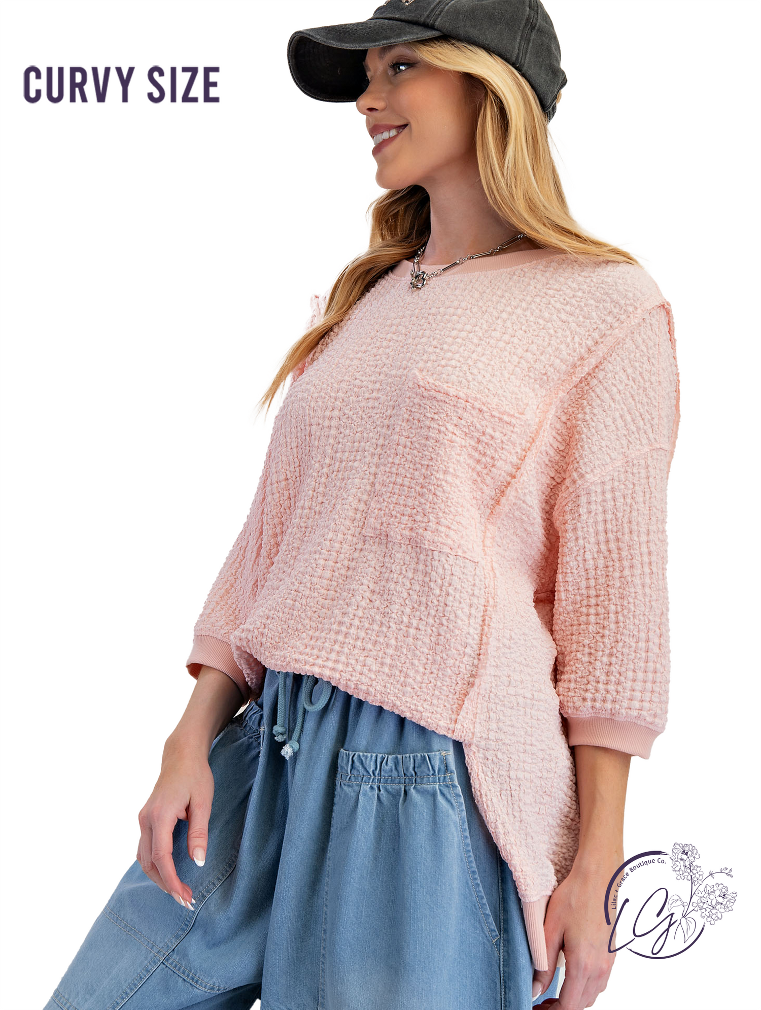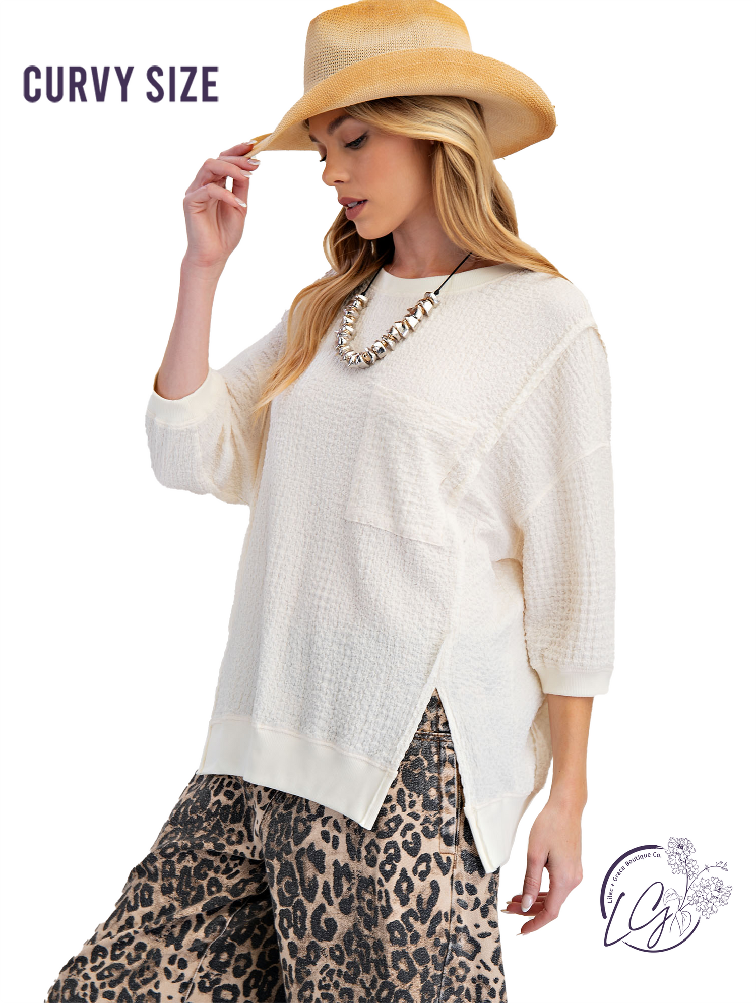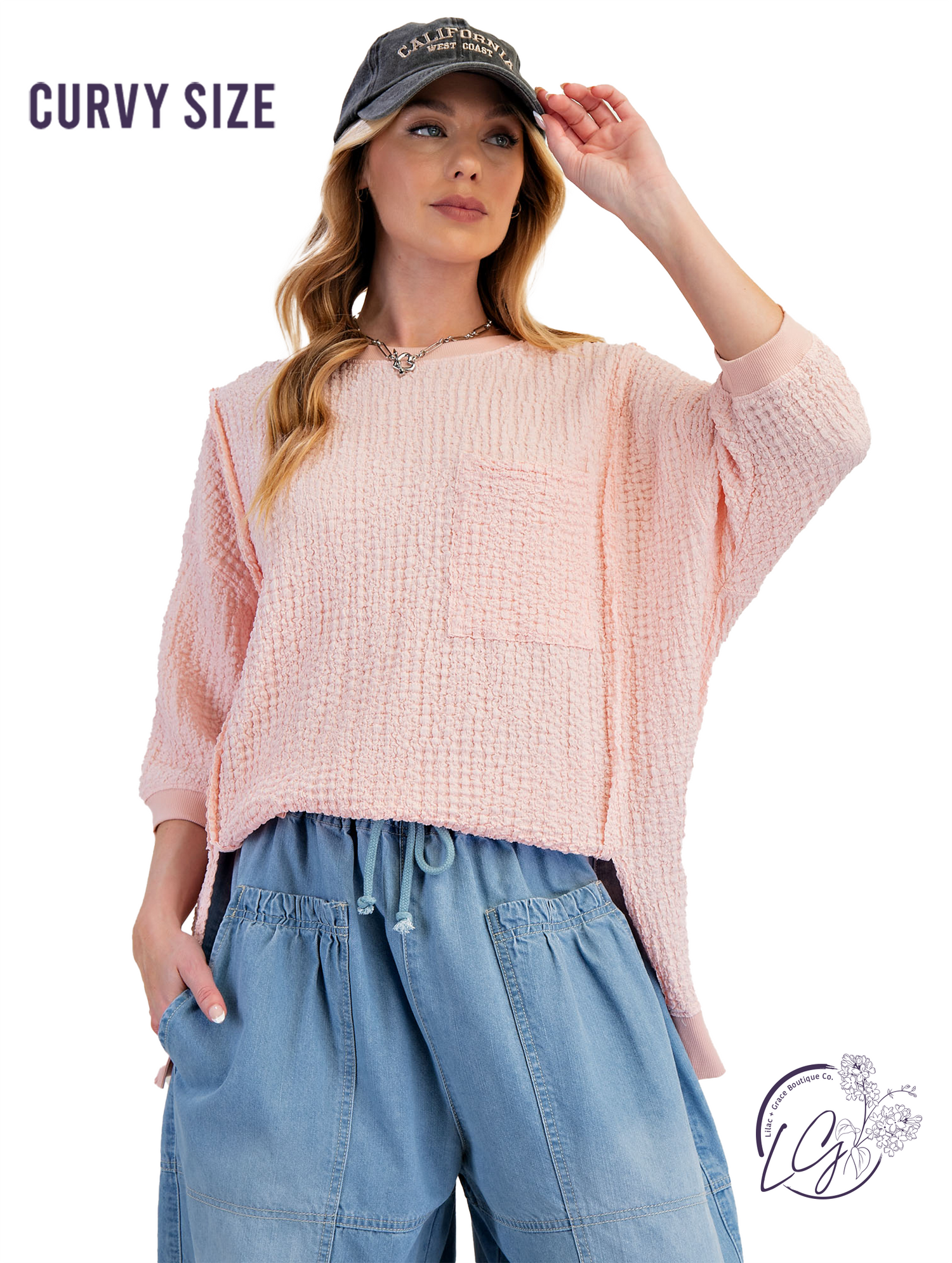 This cozy popcorn knit top features a crew neckline, half sleeves with dropped shoulders, and a boxy, oversized silhouette for ultimate comfort. Deep side slits and a front chest pocket add easygoing details, making it a perfect throw-on piece.