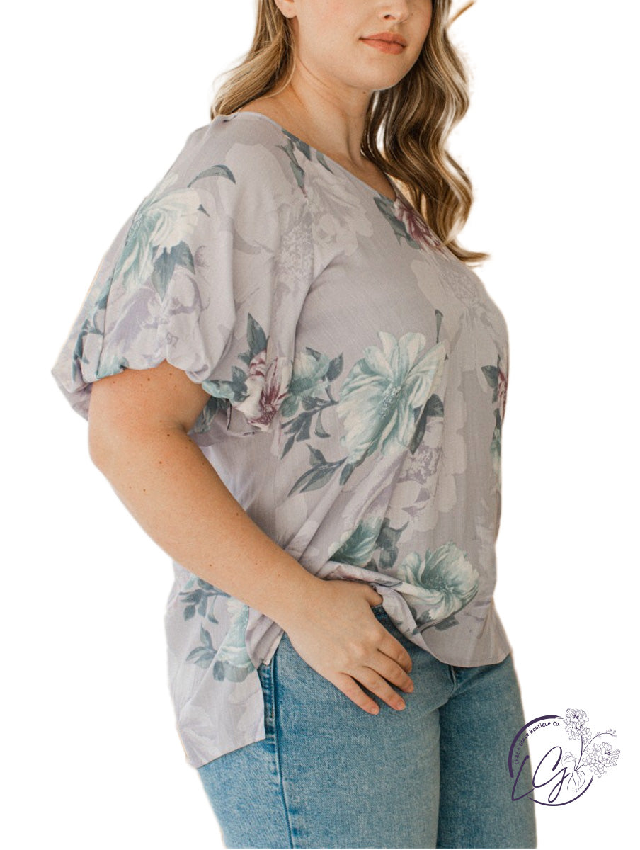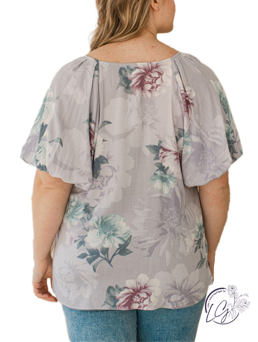 Floral woven print top featuring v-neckline and puff balloon short sleeves.