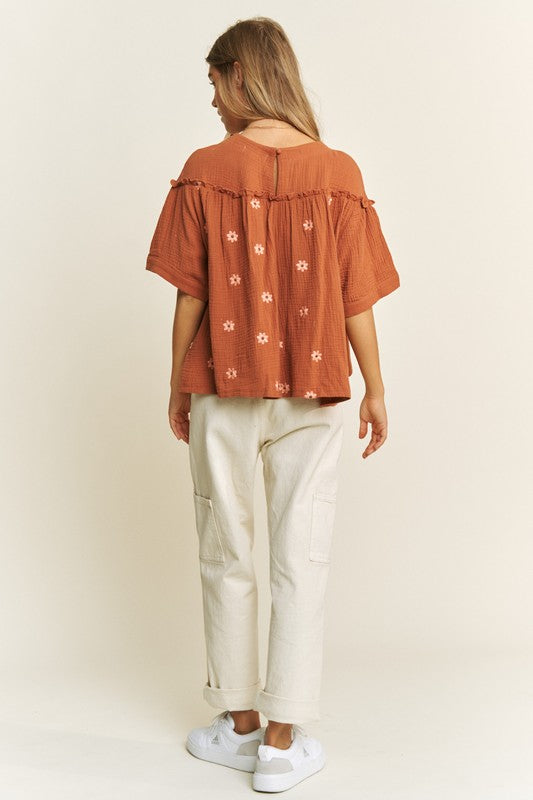 Flirty and fun, this Curvy Boho Bloom Babydoll Top dances with airy gauze fabric and delicate embroidery details. Its flowy silhouette flatters your curves while keeping you cool and comfortable. Perfect for sunny days or layering up for a playful, effortless look!