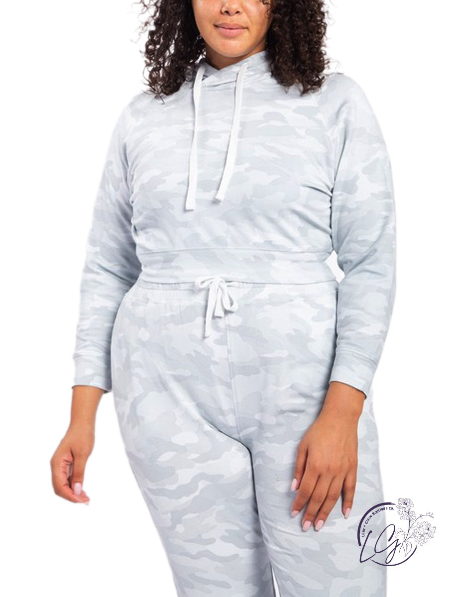 This cropped pullover raglan hoodie features our light tone Ice Camo print. Hood with drawstring closure along with a terry like interior.