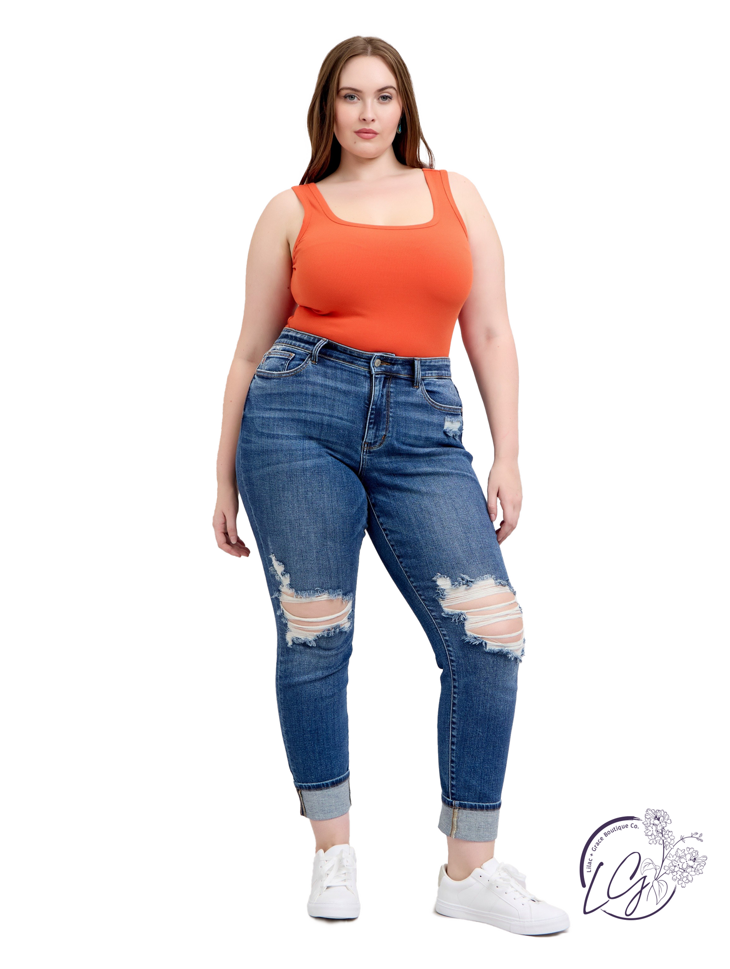 • Model is 5'10" | Wearing Judy Blue Size 14W | Waist: 36" | Hips: 50"