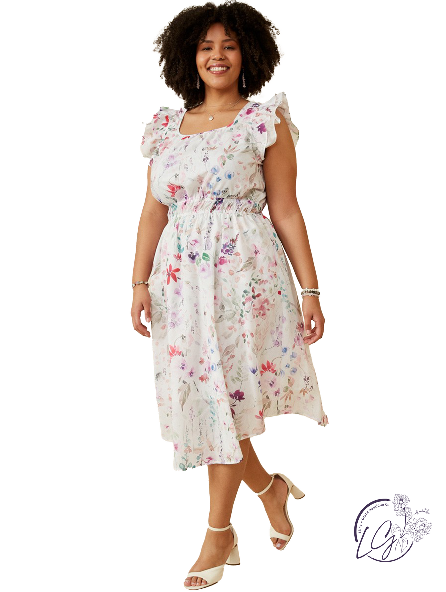 Unleash your inner goddess in our Curvy Paint The Sky Midi Dress! Made from a delicate floral woven fabric, this dress features elegant ruffle shoulder details that will make you stand out from the crowd. With its dress lining, you'll feel comfortable and confident all day. Elevate your style and paint the sky with this stunning midi dress!