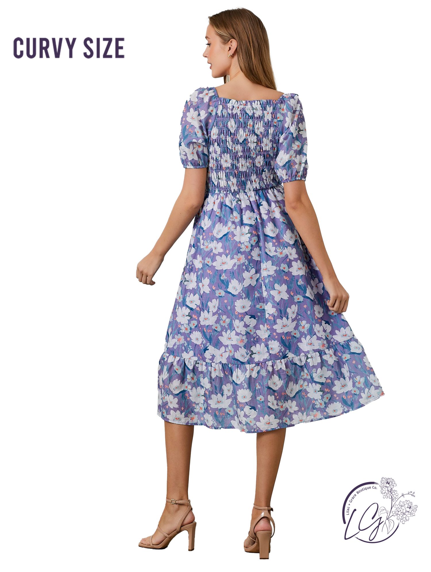 Feminine and flowy, this floral print midi dress features a smocked bodice that hugs comfortably while creating a flattering silhouette. The soft fabric drapes into a relaxed skirt that moves with ease, making it perfect for warm days and casual outings. Style it with strappy sandals and a denim jacket for a laid-back look, or dress it up with heels and statement earrings for an evening out.