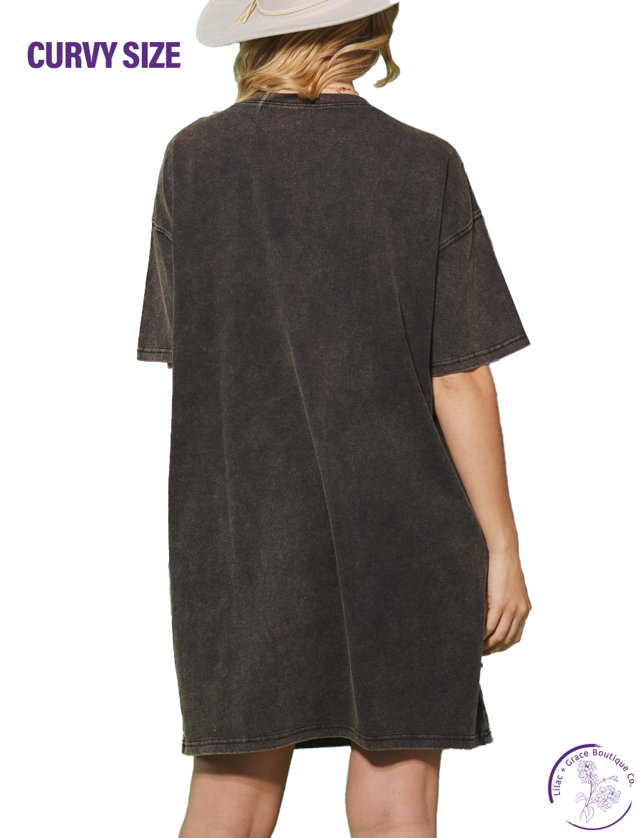 Step into the spotlight with our Curvy Rodeo Star Embellished Mini Dress! The washed solid fabric adds a touch of vintage charm while the star embellishments elevate your style. With short sleeves and a crew neck, this dress is both comfortable and stylish. Perfect for a rodeo, concert, or game day outfit. Be the star of the show in this mini dress!
