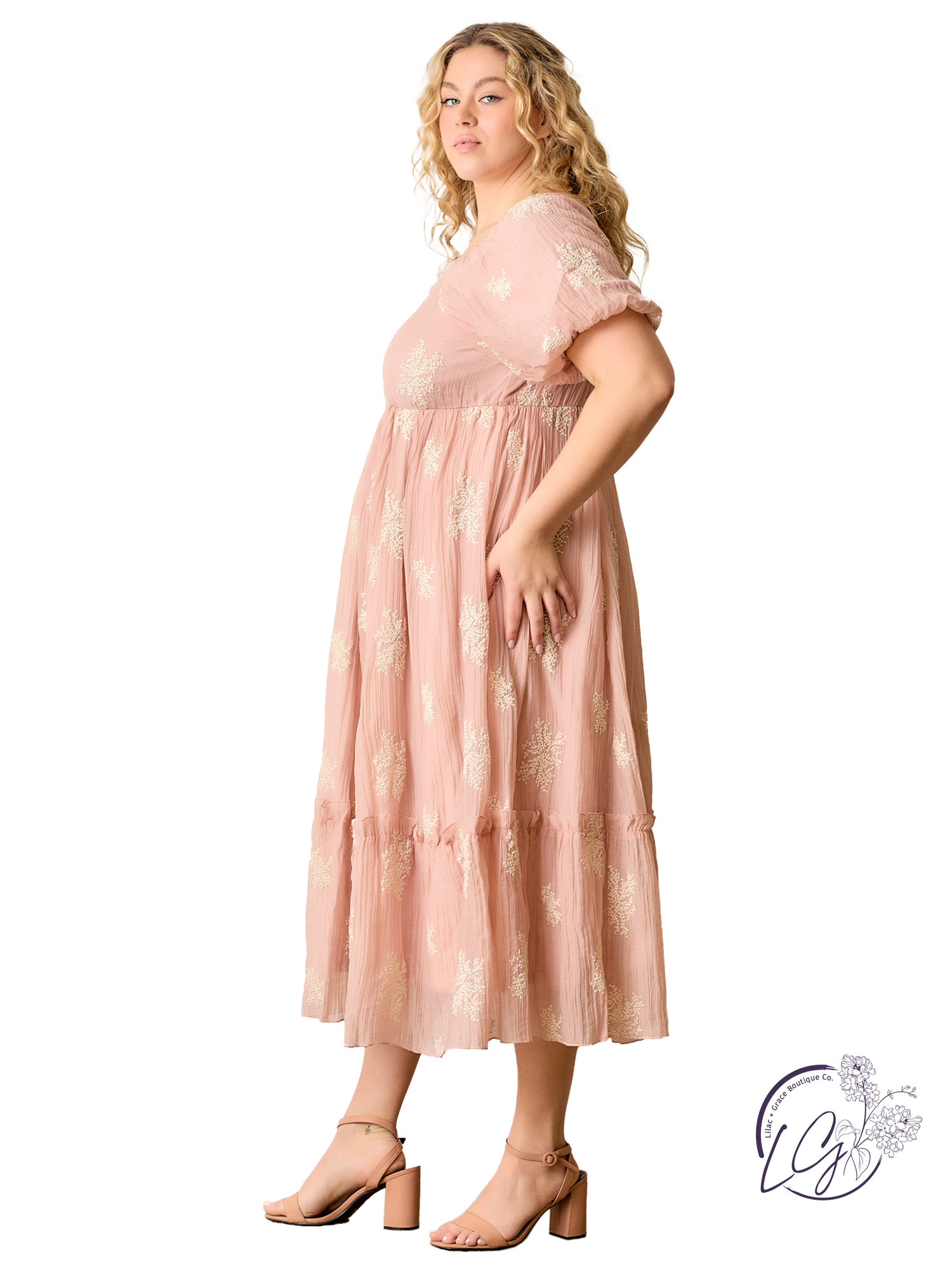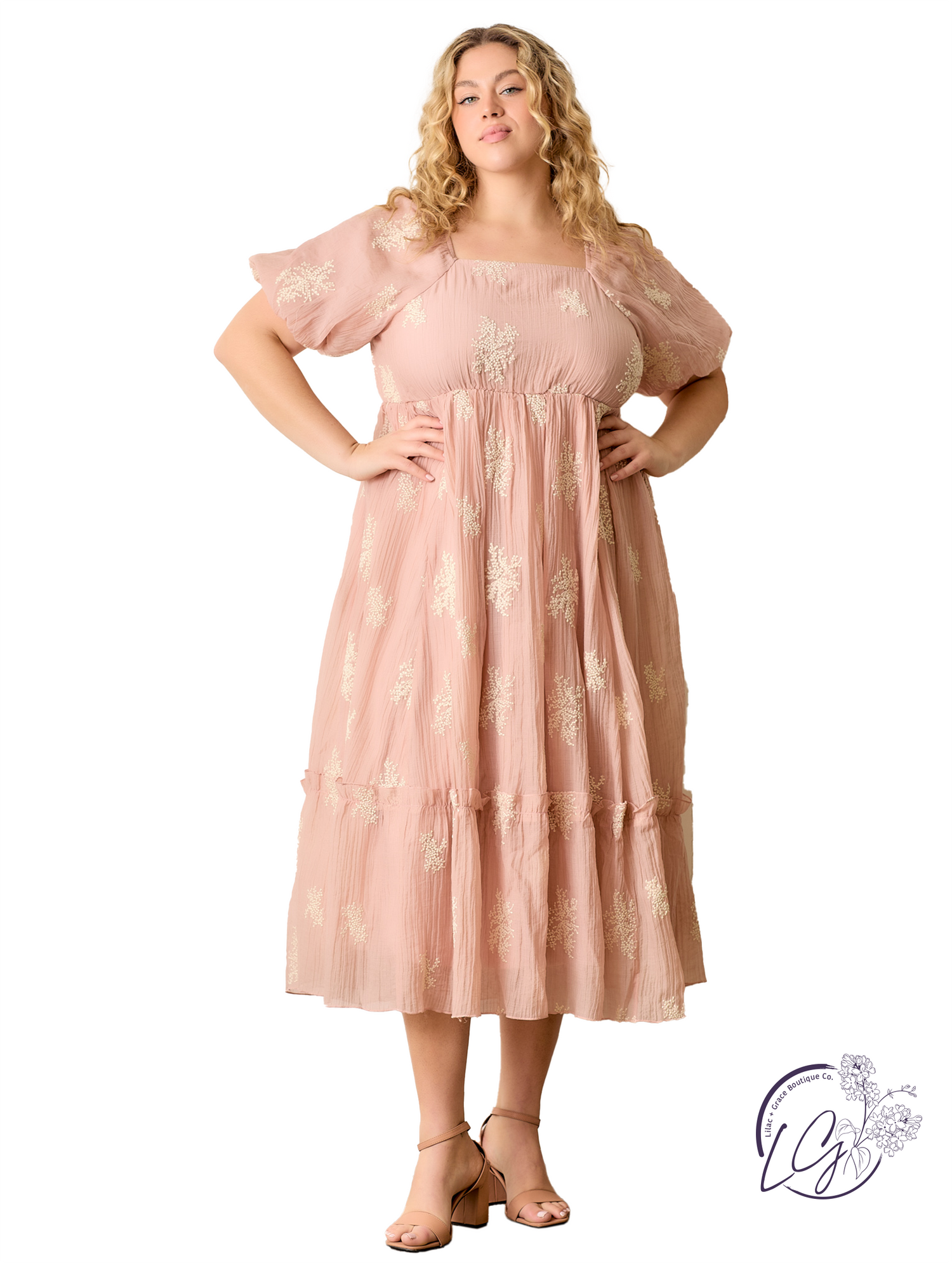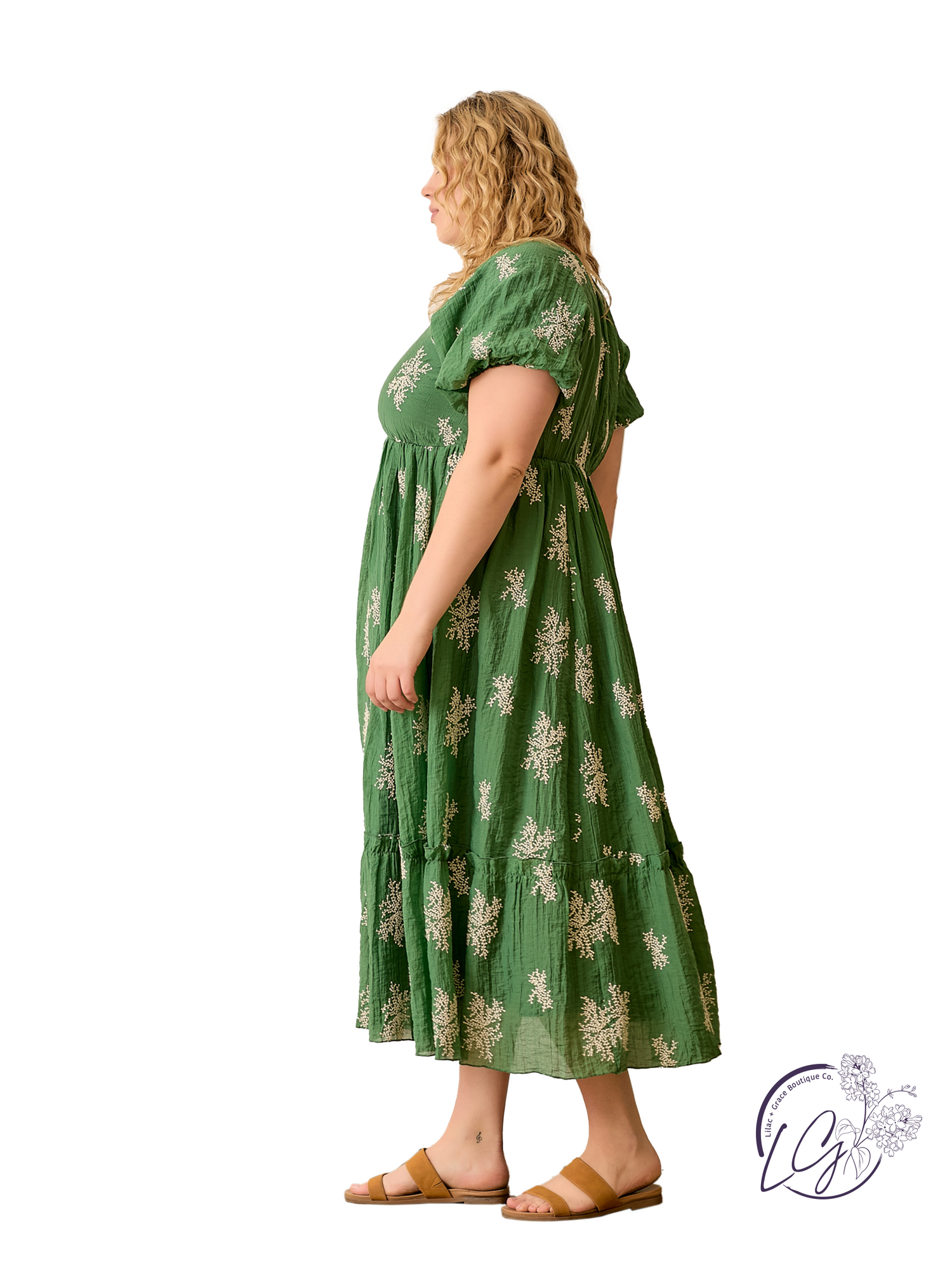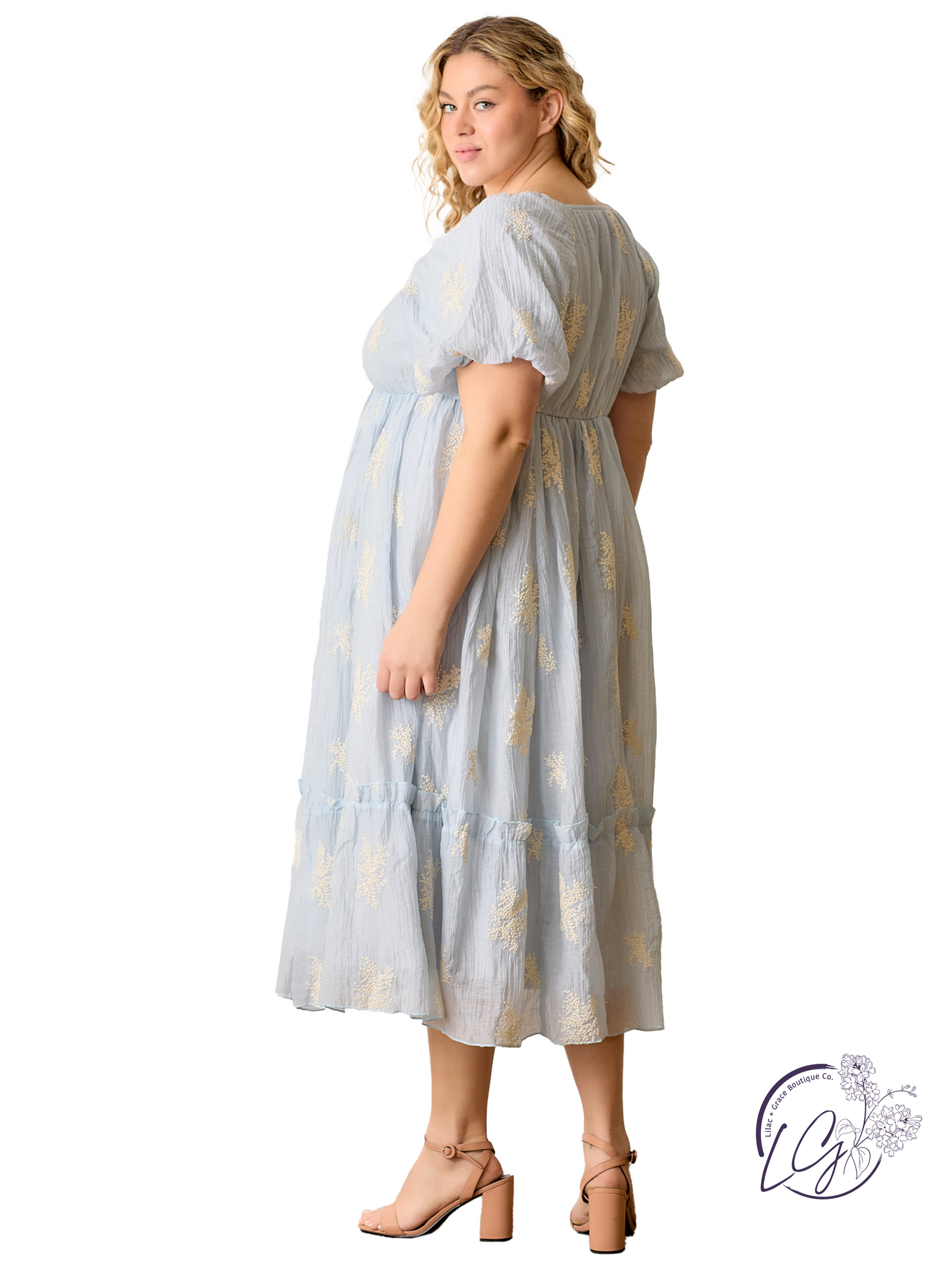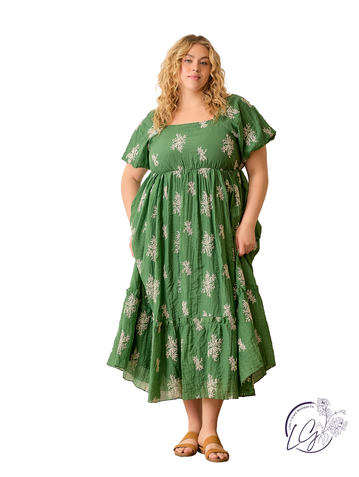 Statement-making, this embroidered maxi dress features a structured square neckline and voluminous balloon sleeves for a bold, feminine silhouette. Intricate embroidery graces the bodice and hem, adding artisanal detail throughout. The full-length skirt flows effortlessly, with bottom detailing that creates soft movement and texture. Pair it with simple sandals or dress it up with heels for a standout occasion look.