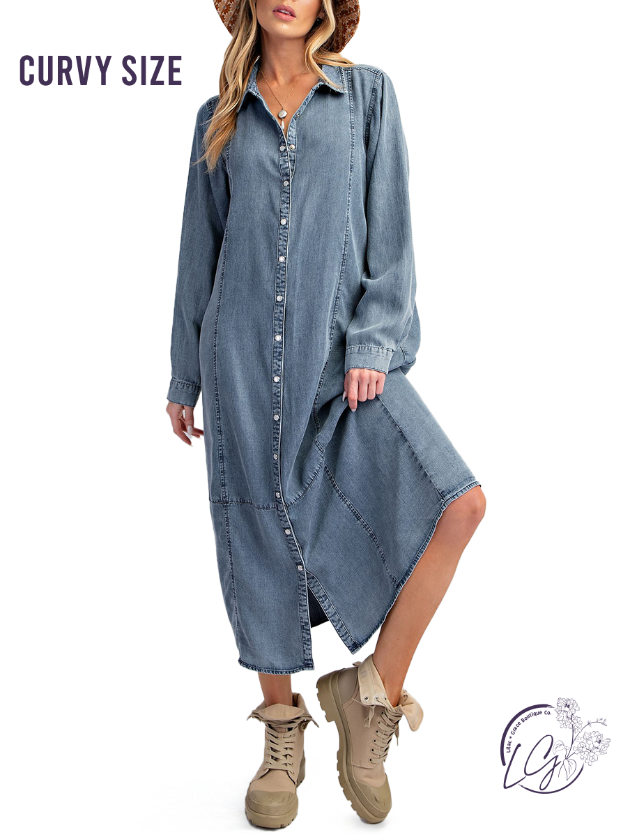 The Curvy Blue Sky Chambray Button-Up Dress is a versatile and timeless garment that exudes casual elegance. With its shirt-style collar and long sleeves, it can be worn as a standalone dress or layered over leggings or jeans for a chic duster-style outfit. The midi length adds versatility, allowing it to transition seamlessly from day to night. Whether dressed up with heels or paired with sneakers for a more casual look, the Curvy Blue Sky Chambray Button-Up Dress is a wardrobe staple that effortlessly combines comfort and style. Can be worn as a shirt/dress/duster.