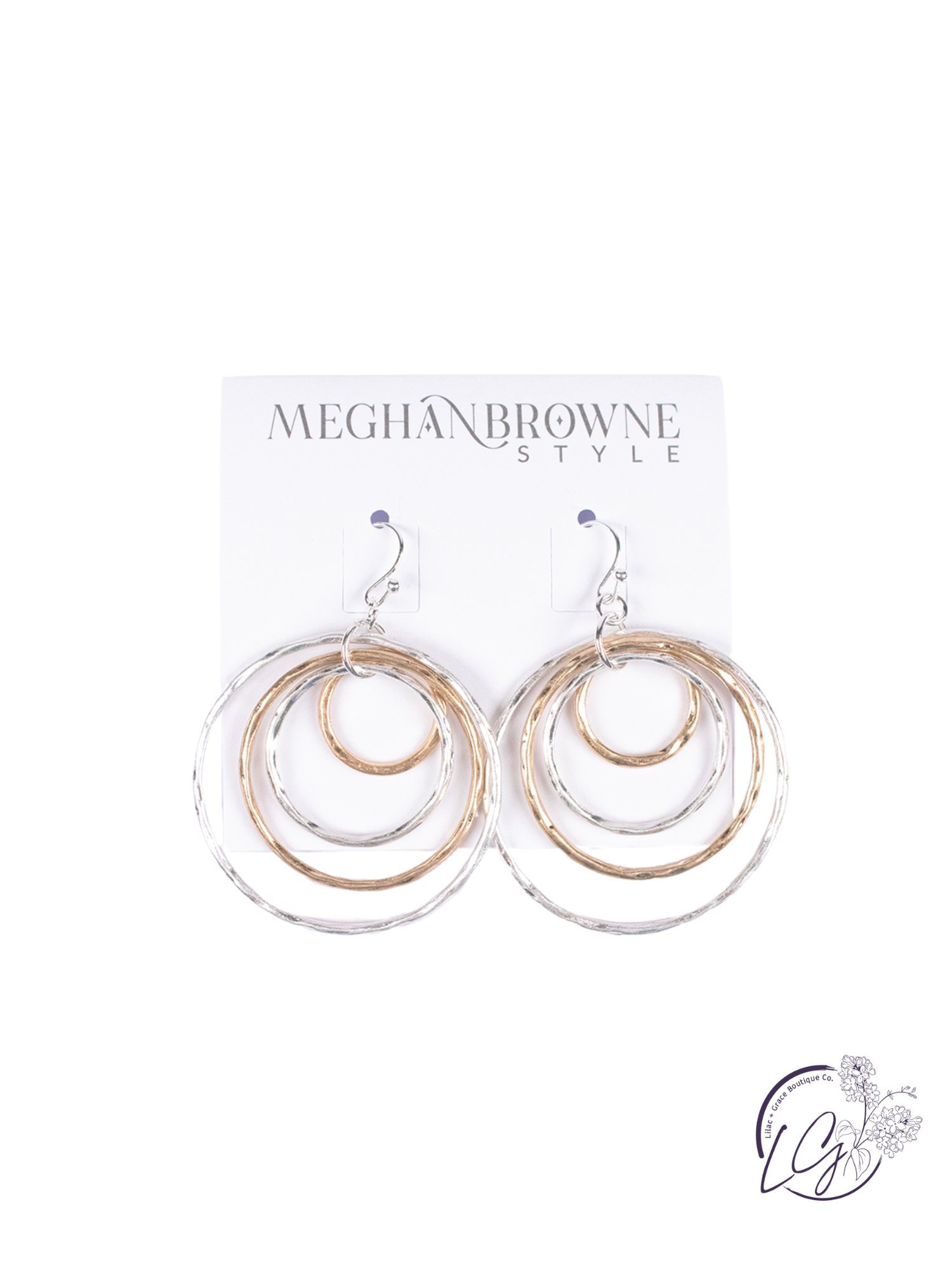 These earrings embody a perfect balance of texture and dimension, featuring multiple interlocking rings of varying sizes. The hammered finish adds a refined touch, creating an eye-catching interplay of light and form. Suspended from hook-style fastenings, they offer effortless wear while ensuring a secure fit.