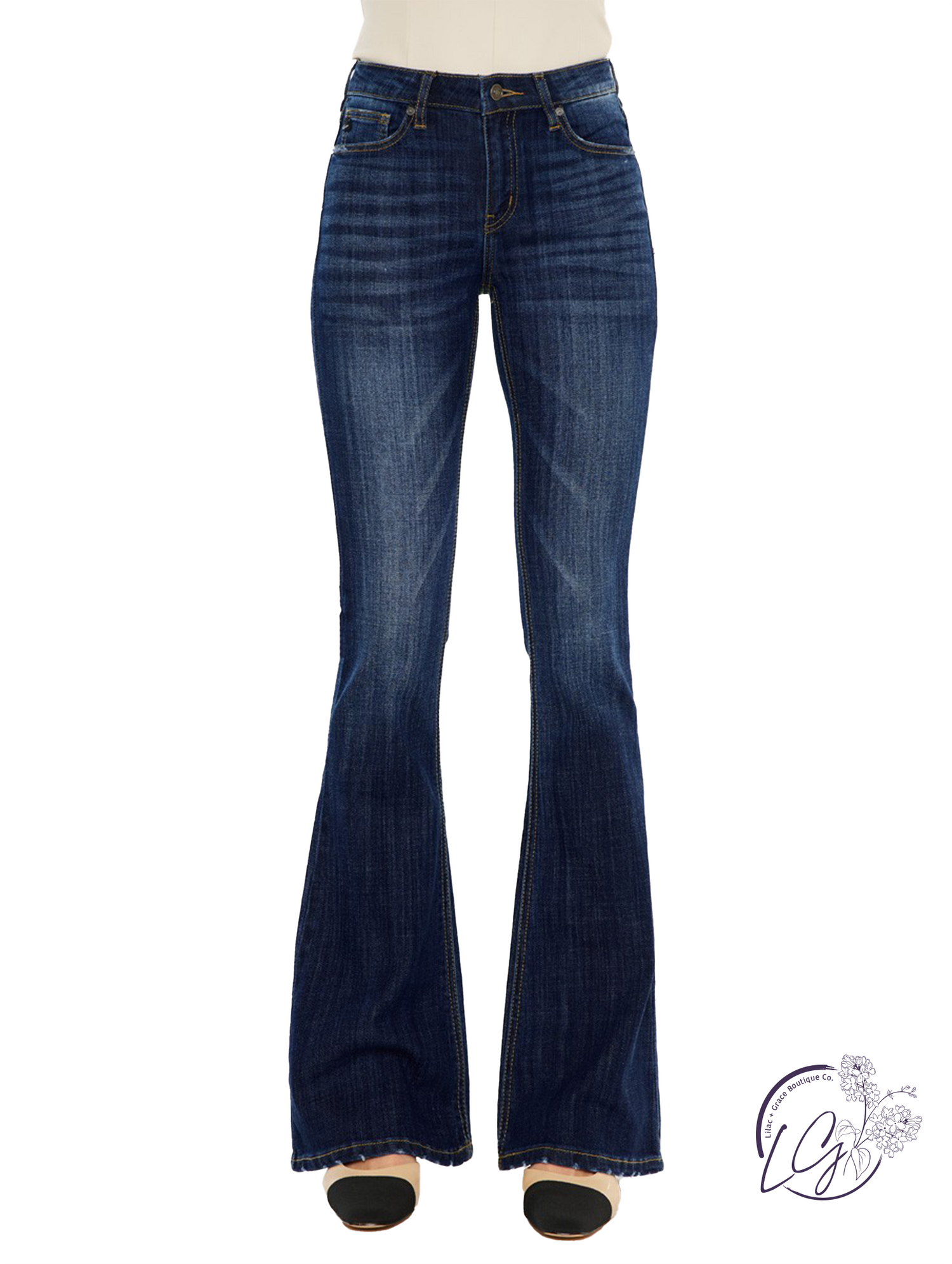 Take on any challenge with these Effie Mid Rise Flare Jeans by KanCan! With a dark stone wash and non-distressed finish, these stretchy jeans offer a clean, basic look. The zip fly and 9" rise provide a comfortable fit while the 33.75" inseam adds a bold, daring touch. Imported for top quality.
