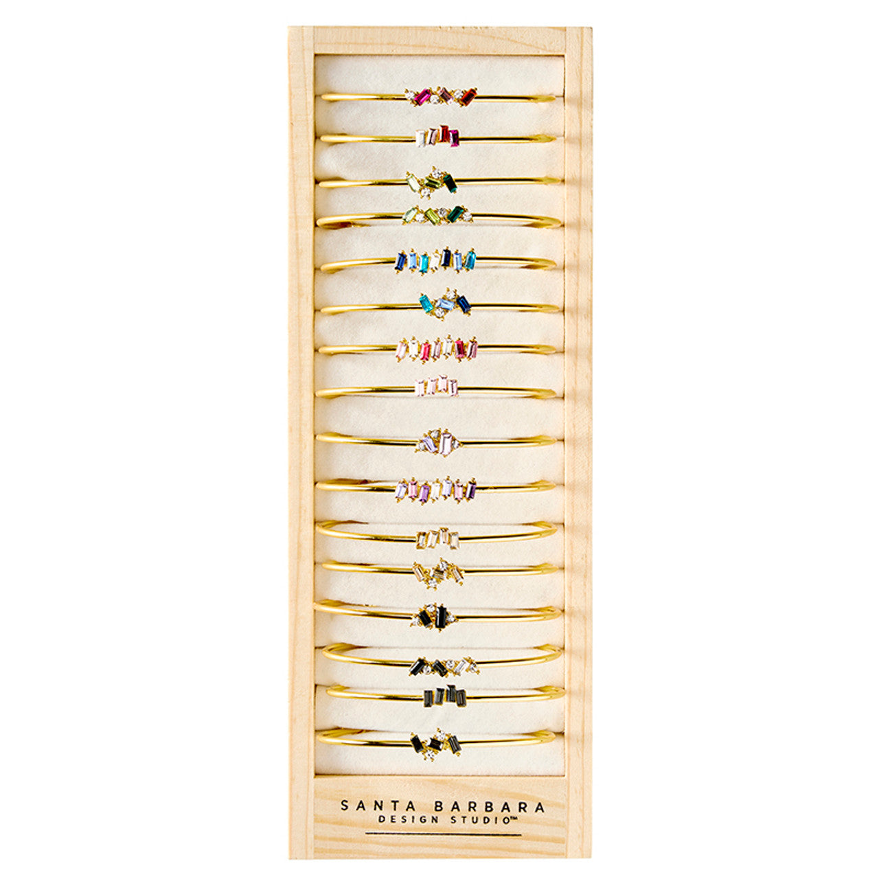 • Baguette-cut crystal accents in assorted hues