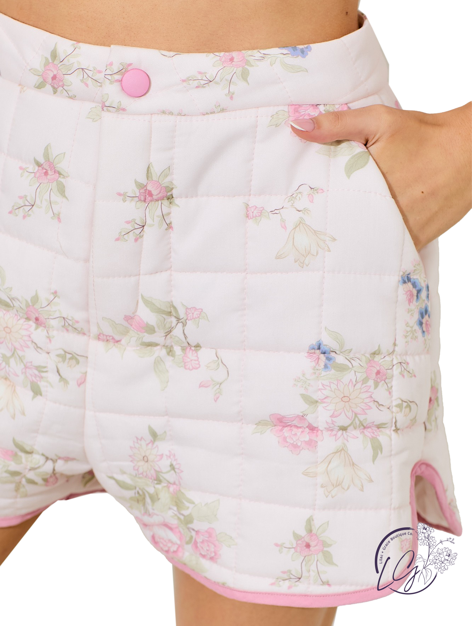 These floral print quilted shorts feature a soft, textured design with functional side pockets for everyday ease. The relaxed fit and comfortable waistband make them ideal for laid-back days, while the quilted fabric adds a touch of structure. Pair with a simple tee or tank for an easy, casual outfit with a playful twist.