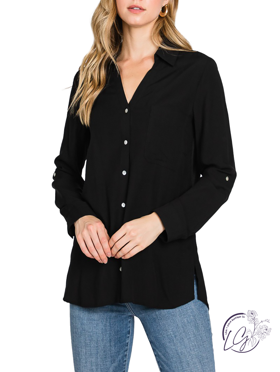 V-Neck Button Down with Roll-Up Sleeves, Chest Pocket and Rounded Bottom. This Casual Shirt has a Relaxed Fit with Soft Material.