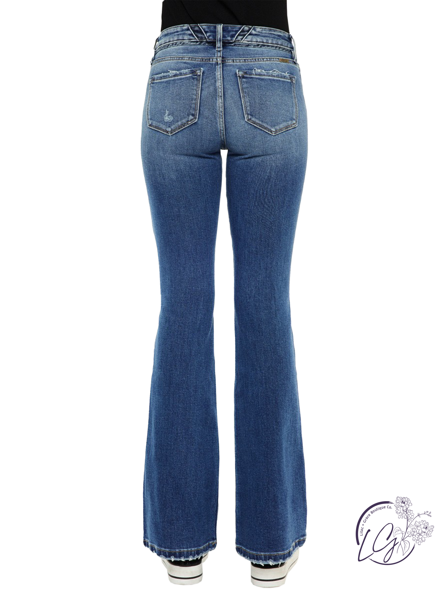 Take on new adventures with our Hattie Mid Rise Flare Jeans! Designed with a dark wash, stretch fabric, and zipper fly, these jeans offer both style and comfort. The open pack and contrast waistband elevate your look while the 9 1/4" rise and 32" inseam flatter your figure. Push boundaries in these must-have jeans!