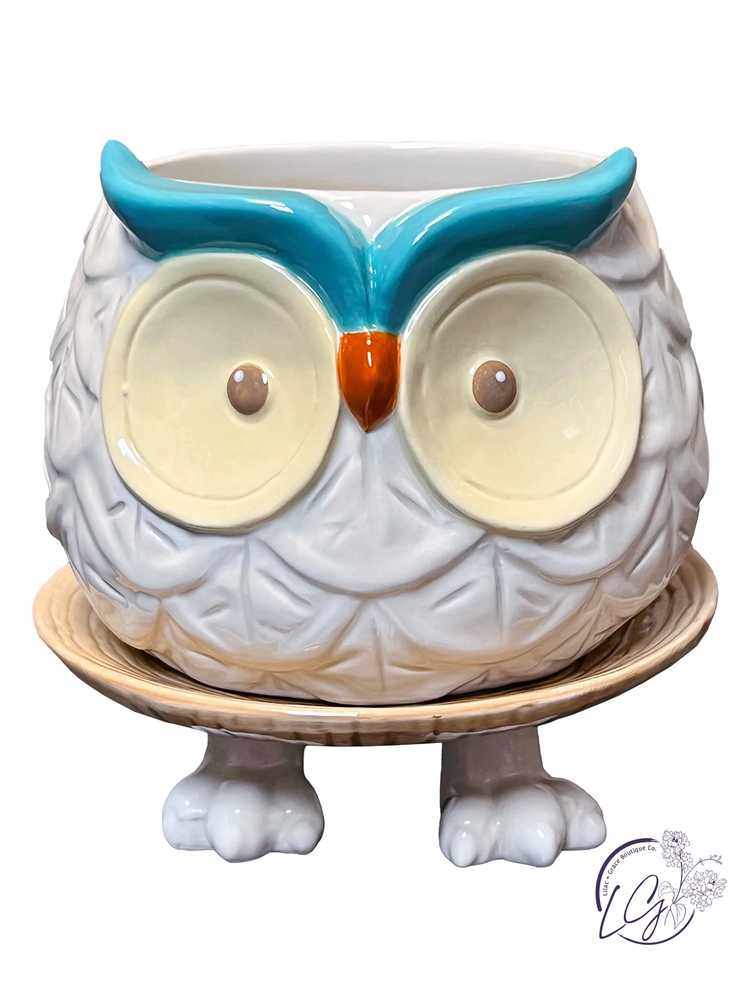 Propped up on it's own 'footed' dish, this charming, ceramic "Hoots" the Owl footsie planter will elevate your space. Removable water-catch plate adds charm that makes this planter stand alone.