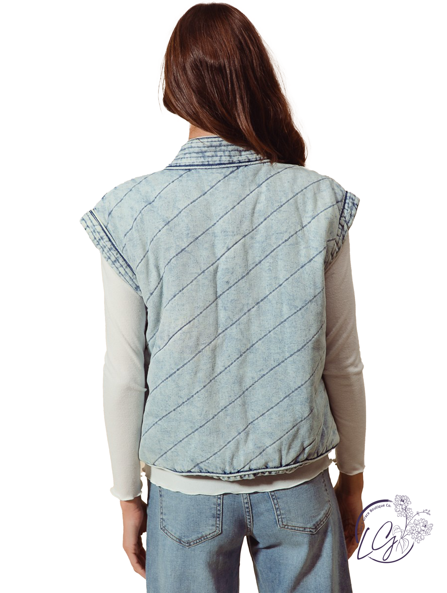 Introducing the Horizons Vintage Denim Vest! With a kimono style open front and pockets, this vest is both stylish and functional. The vintage washed quilted denim adds a unique touch, perfect for those who love a vintage aesthetic. Elevate any outfit with this must-have piece!