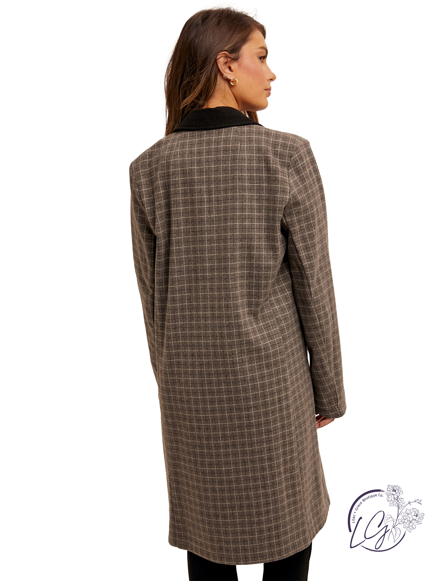 Get ready to be embraced by warmth and style with our Layers Hug Me Tight Coat! Featuring a trendy check pattern and a cozy corduroy collar contrast detail, this double breasted coat will keep you looking and feeling fabulous. With convenient pockets, it's the perfect combination of fashion and functionality.