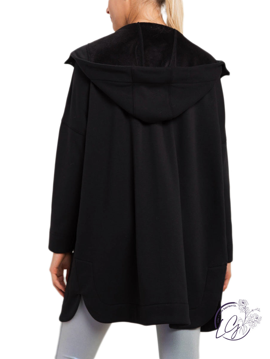 Cozy up in this longline zip up hoodie jacket. It falls to about mid-thigh length, has a soft interior, a curved hemline with notched sides, and side pockets with curvilinear stitching.