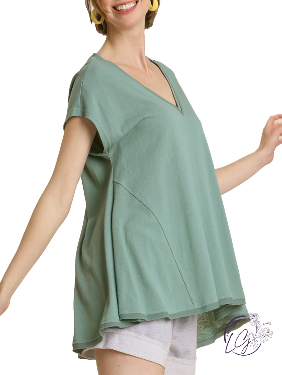 V-Neck Short Folded Sleeve Top with Side Slits and Raw Edged Hem