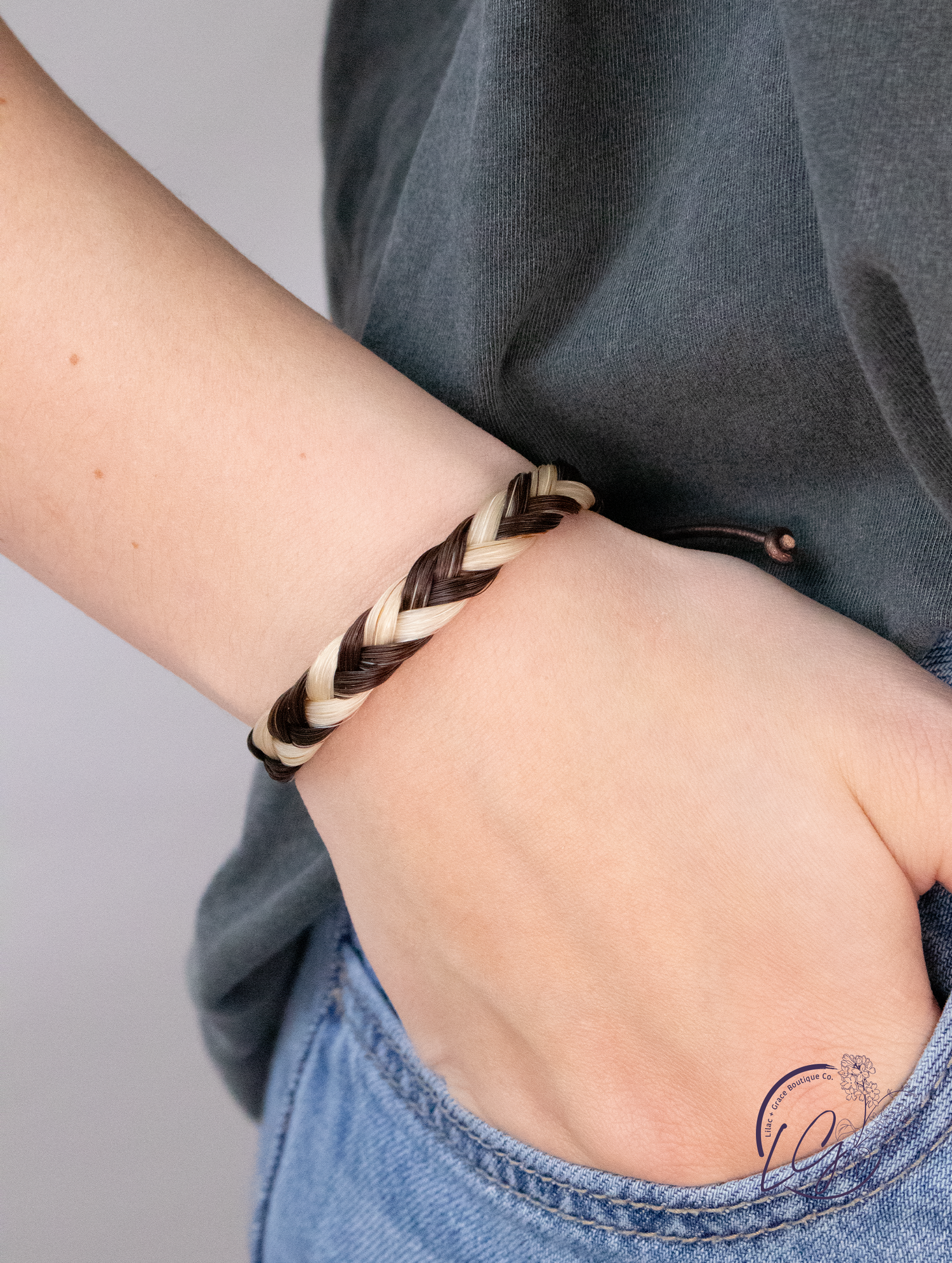 A two-toned assassin, Lunatic Fringe was an inspiration for our bi-colored bracelet. Our five strand braid made with two colors of horsehair is fully adjustable using leather that slides through round stoppers. One size fits all.