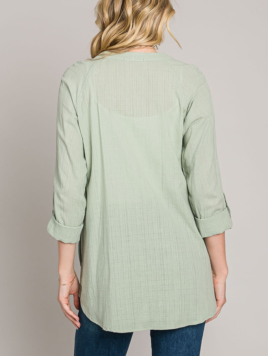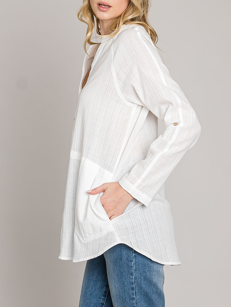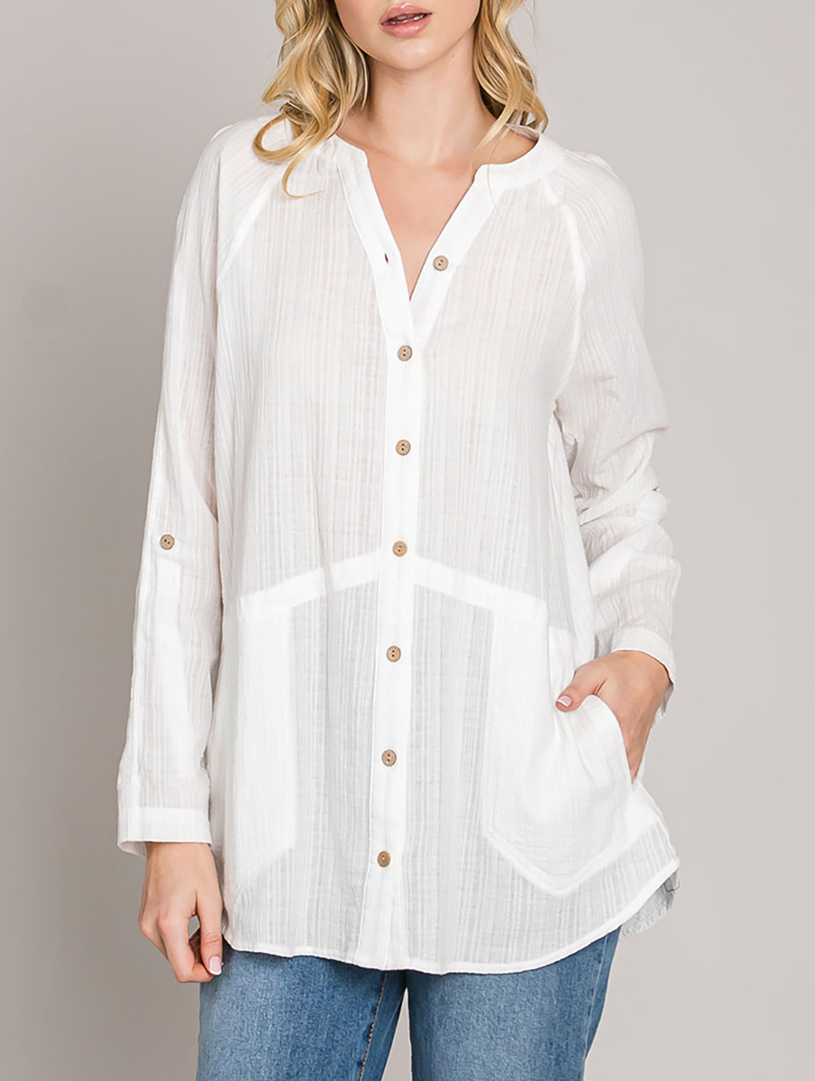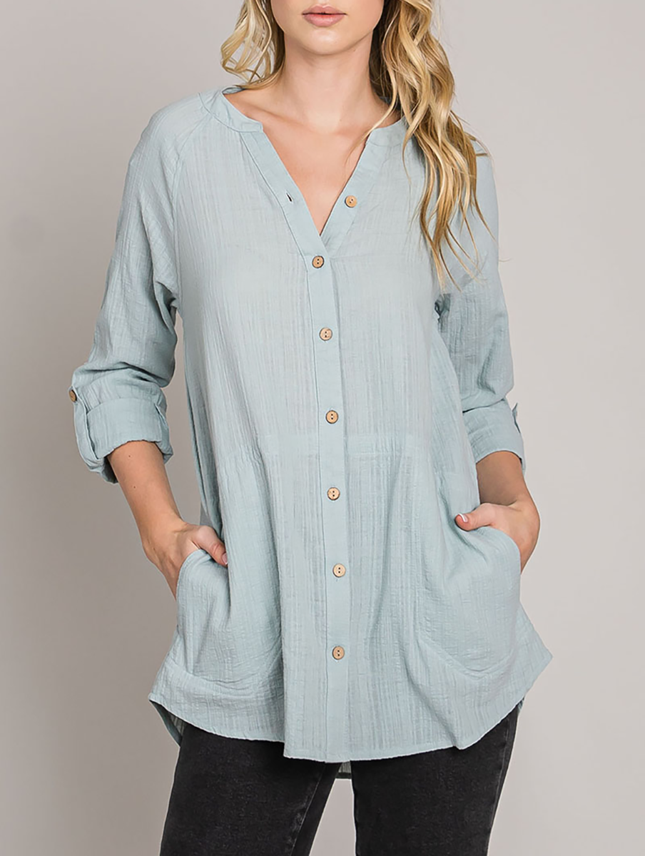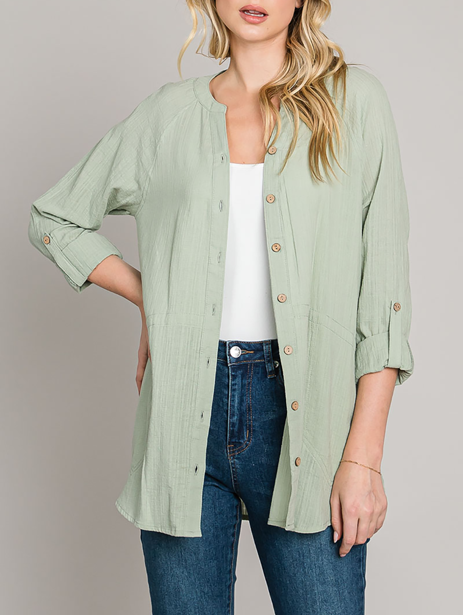 Oversized Button Down Shirt with a Mandarin Collar and Wooden Buttons for a Natural Detail. Sleeve Cuffs to make the Shirt 3.4 Sleeve with pockets!!