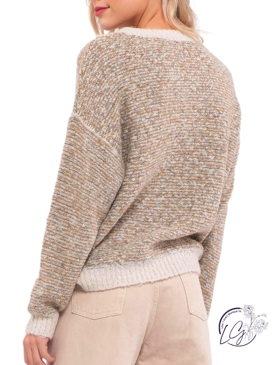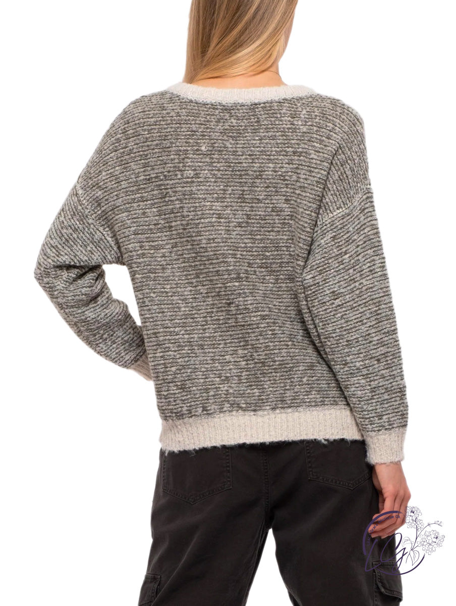Features: Long Sleeves, Split Neckline, Marled Knit, Contrast Trim, and button Closure