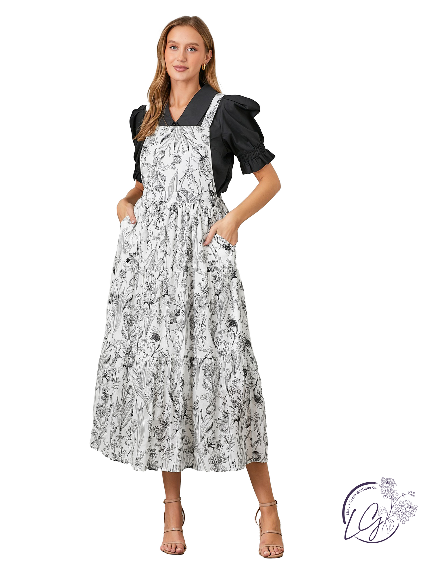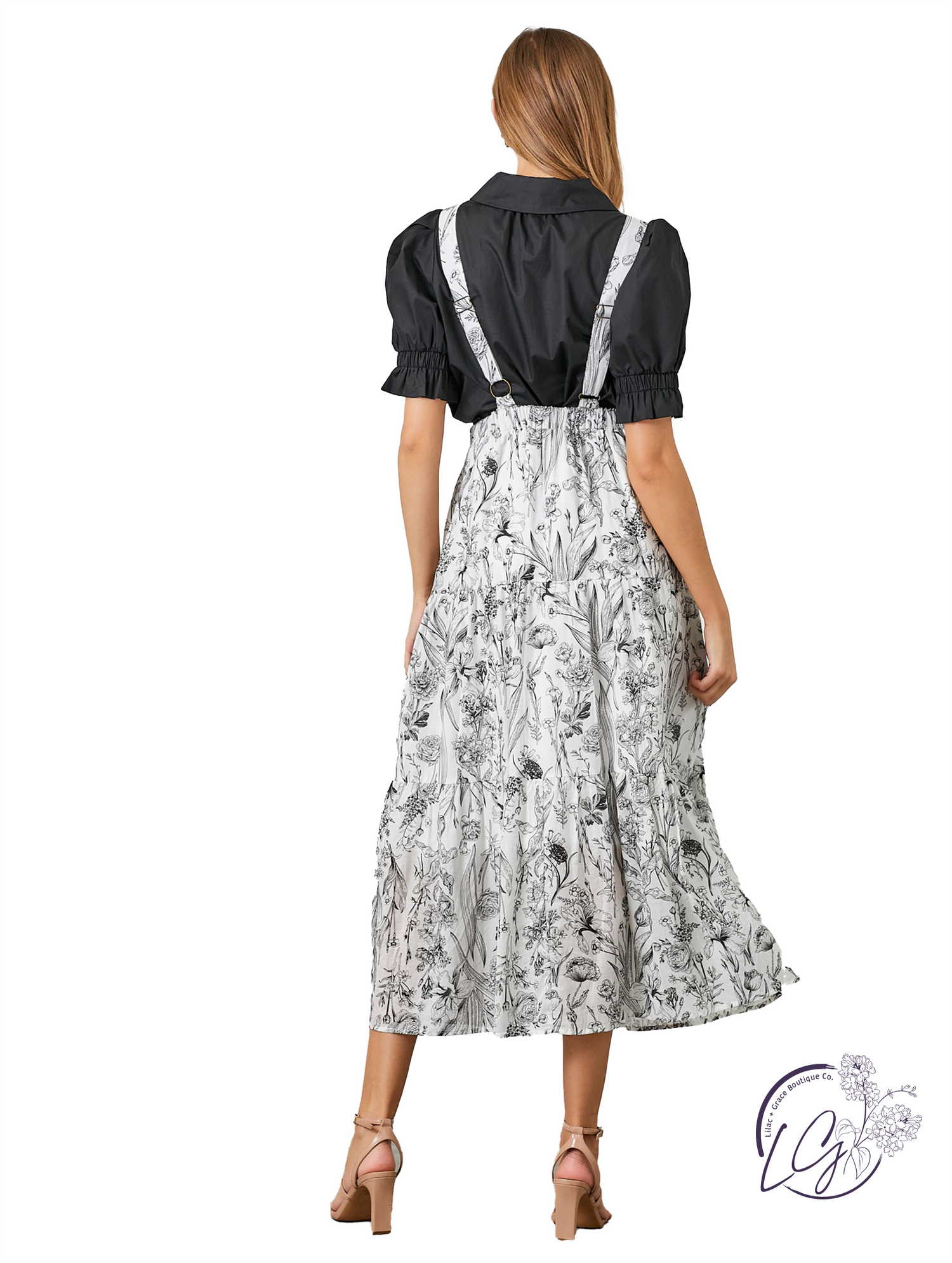 Playful and feminine, this floral print midi skirtall features soft tiers and a flowy silhouette that moves with ease. Adjustable straps and a square neckline bring a hint of structure, while the midi length keeps it relaxed and wearable. Perfect for layering over a fitted tee or tank, it’s an easy way to add personality to your warm-weather look. Just finish with sandals or sneakers for a casual, creative vibe.