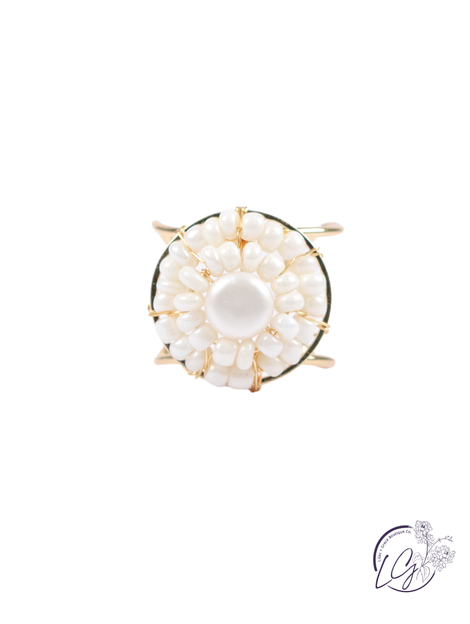 Elevate your look with this Meghan Browne Style statement ring, designed with sophistication and charm. Featuring a radiant gold-tone band, this piece showcases a beautifully arranged cluster of pearl-like beads, creating a bold and elegant aesthetic. The luminous beads add depth and dimension, offering a refined touch that pairs effortlessly with both formal and casual outfits.