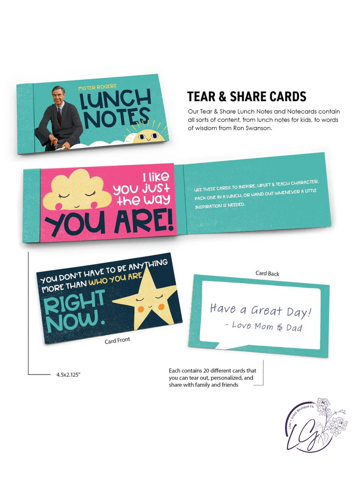 These Lunch Note booklets are filled with inspiring Mister Rogers quotes and imagery of Fred Rogers himself. Each card can be torn out of the booklet and are blank on the back, allowing for personalization.