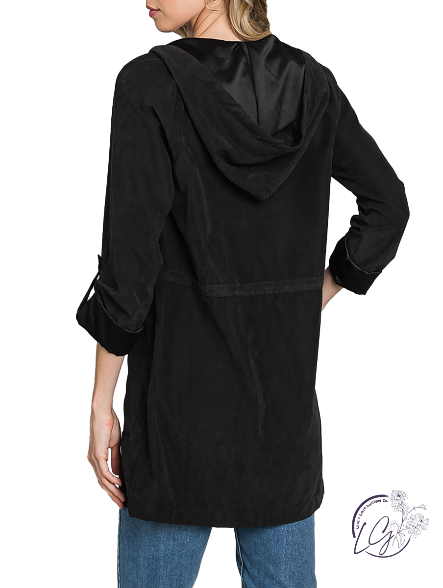 Long Jacket with Hood and Drawstring at the neckline. Soft Suede-Like Material with Inner Satin. Featuring Rolled Cuffs, Waist Drawstring, and Wide Lapels.
