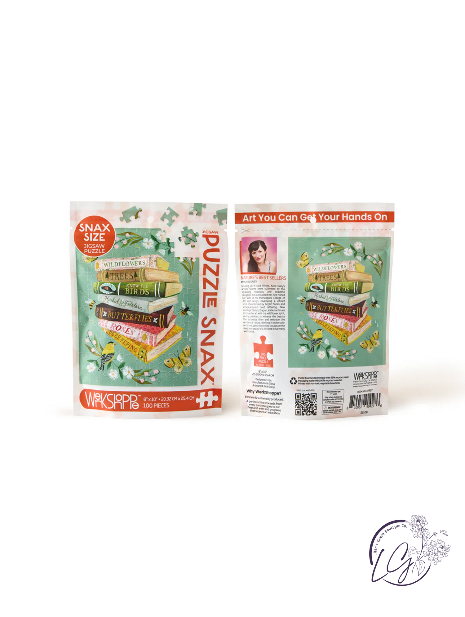 Enjoy a moment of literary escape with our 100-piece Puzzle Snax depicting a stack of nature-themed books. Intricate details of book spines create a serene puzzle-solving experience. Ideal for both avid readers and nature enthusiasts.