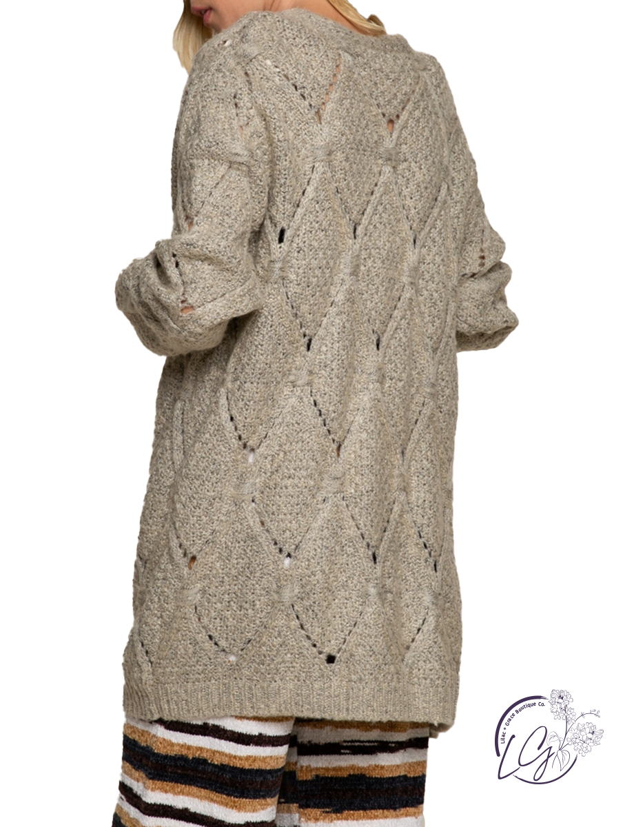 Designed in open cardigan, long sleeve, relaxed fit, featured in acrylic sweater with diamond eylet pattern