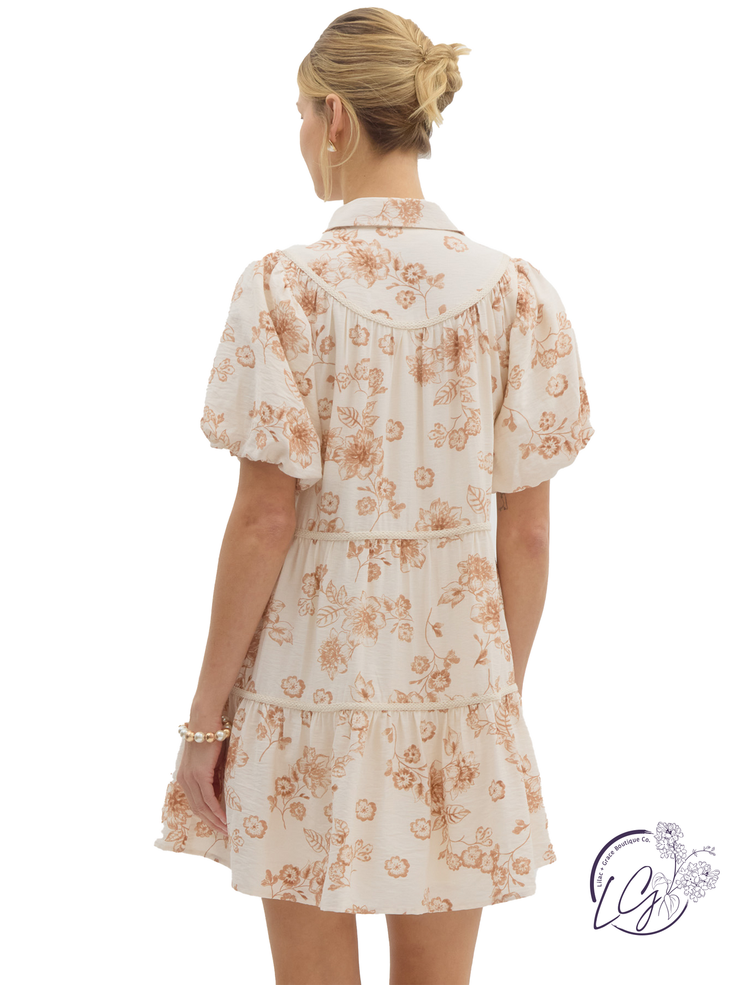 This tiered mini dress features floral print trim accents, short bubble sleeves, and a classic shirt collar with a front button closure for a polished finish. Made from lightweight woven fabric, it's fully lined and non-sheer, offering comfort with every wear.