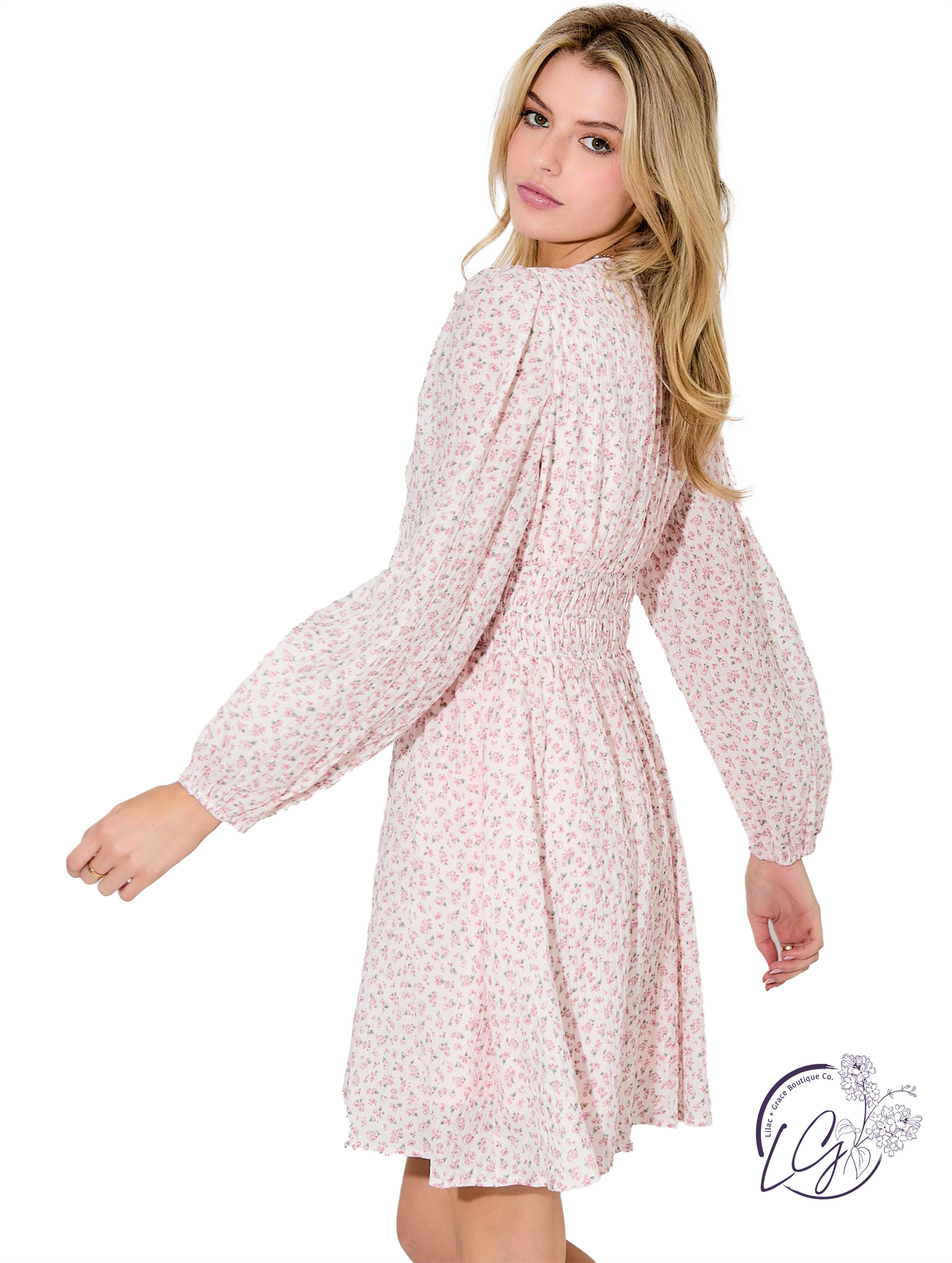 This floral print mini dress features a flattering V-neckline and voluminous balloon long sleeves for a soft, romantic shape. A defined waist detail creates a balanced silhouette, while the mini length keeps the look playful and fresh. Style it with boots or heels for anything from brunch to date night.