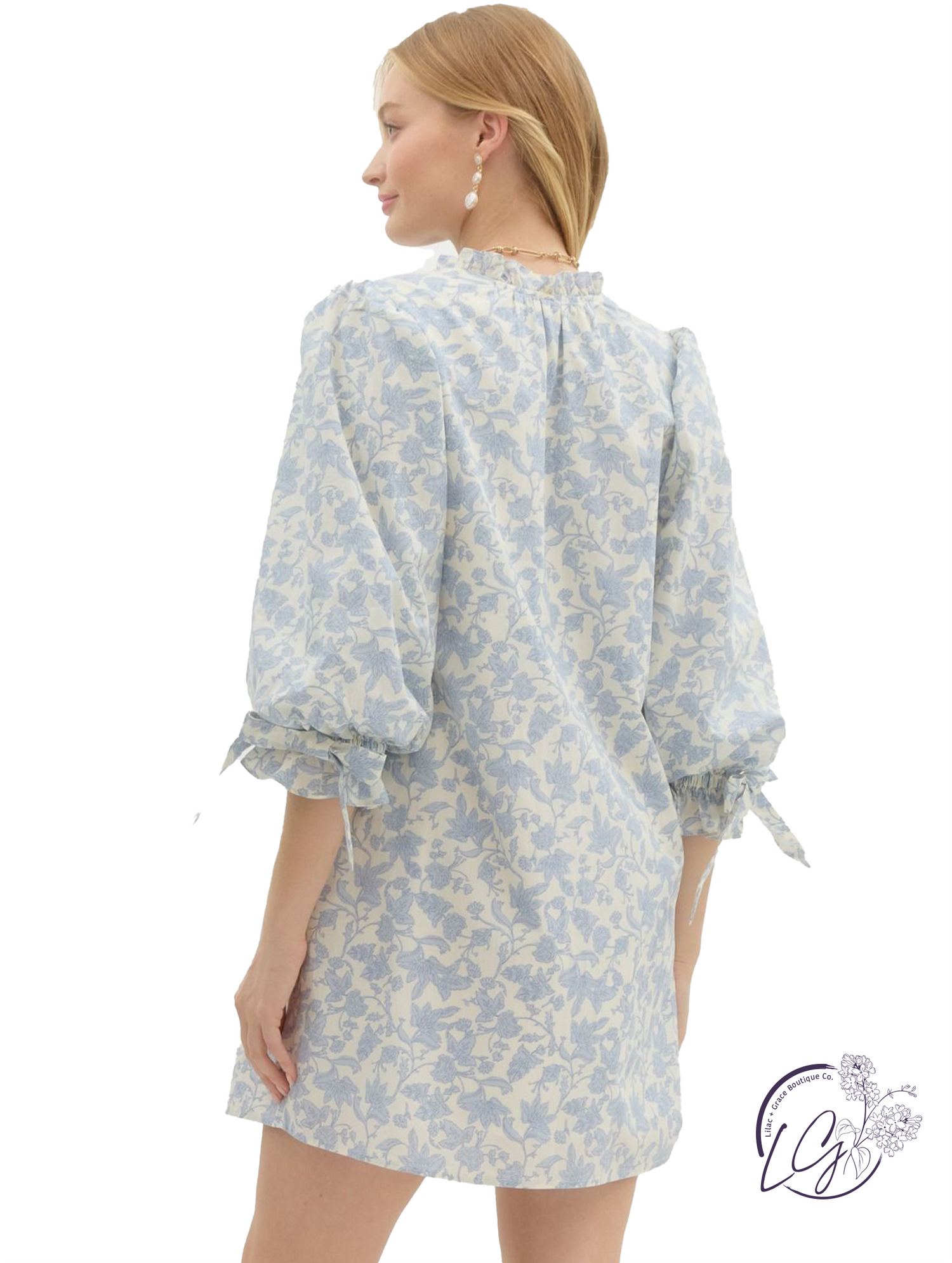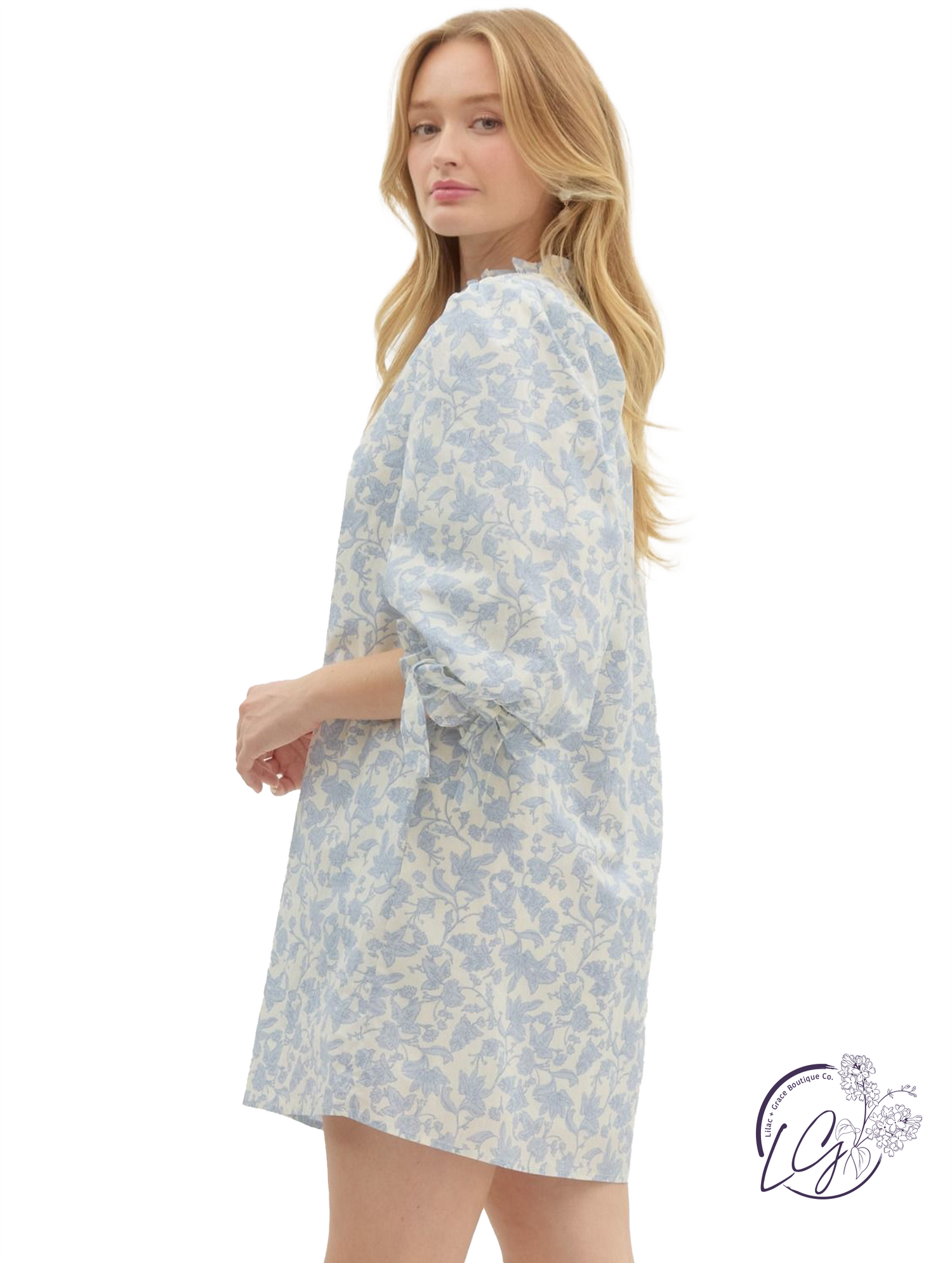 This floral print mini dress features ¾ puff sleeves with elasticated openings, accented by fixed ribbon ties for a soft, detailed finish. The pullover design offers ease and comfort, while the lightweight fabric and gentle silhouette make it perfect for warm days. Style it with flats or ankle boots for a feminine look with a playful twist.