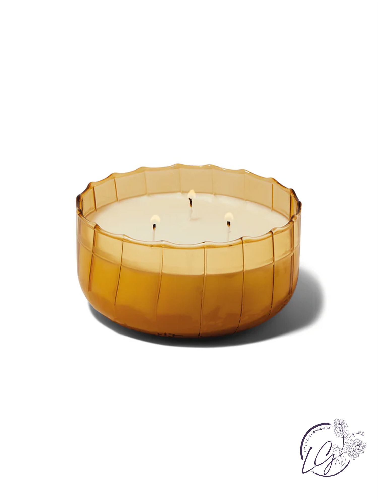 The Ripple - Golden Ember 12oz Candle is designed to elevate tablescapes. Bring a vintage touch to your next dinner party with the subtle and finely ribbed colored glass vessels.